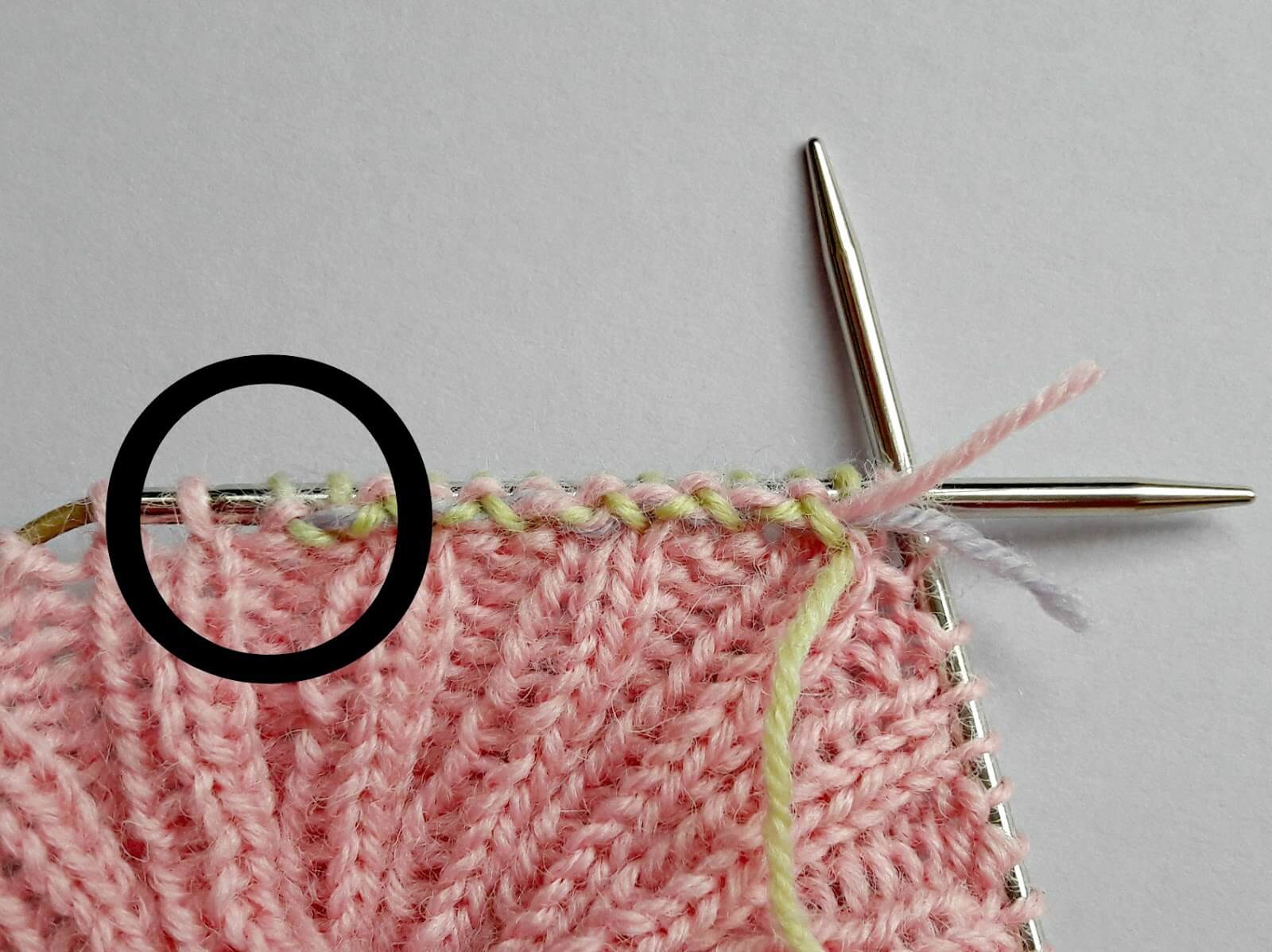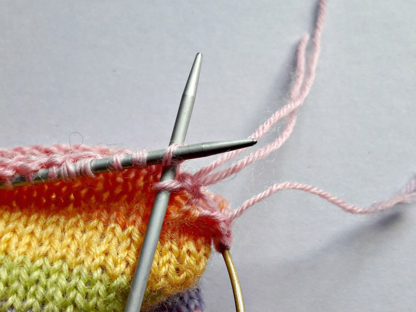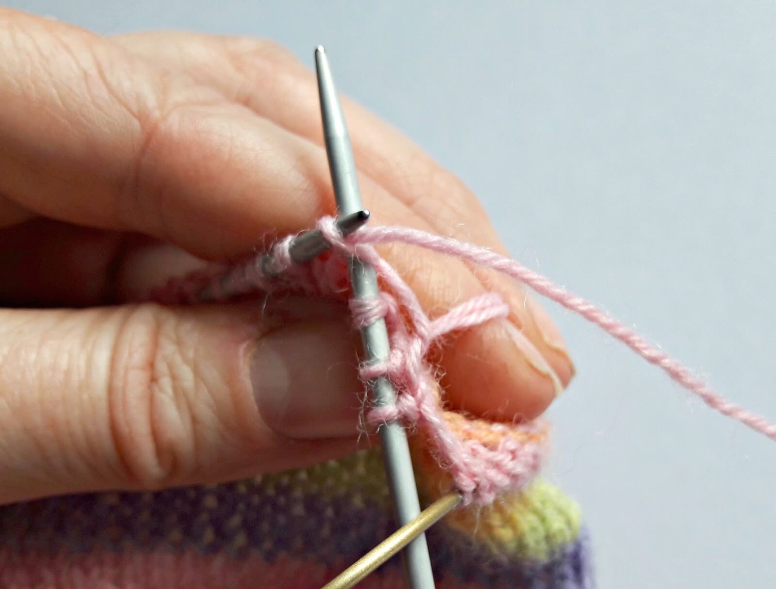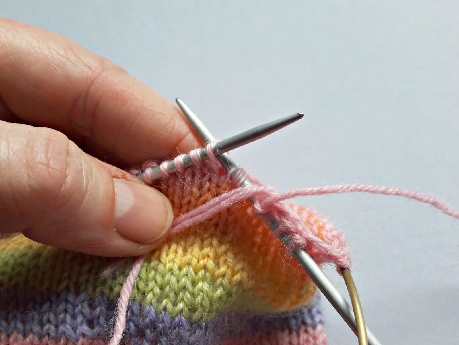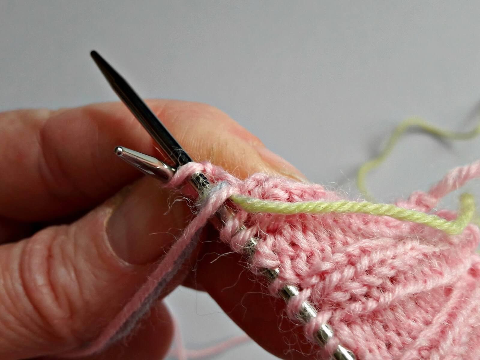 Holding the contrast yarn that you’ve been using out of the way for a moment, knit the next stitch with the new main yarn (that’s the slightly fuzzy green stitch in this photo). You can see the new green working yarn on the right and at the top of the picture is the contrast pink yarn and the purple end of the new yarn. If you’re using a brand new ball of yarn such as the Sherbet Fizz that I’m using and you want your socks to match, make sure that you start knitting with the second colour out of the ball not the first, as there’s no way of knowing whereabouts in that first colour the yarn was cut to start the ball – in my case, the purple was first out of the ball followed by the green.