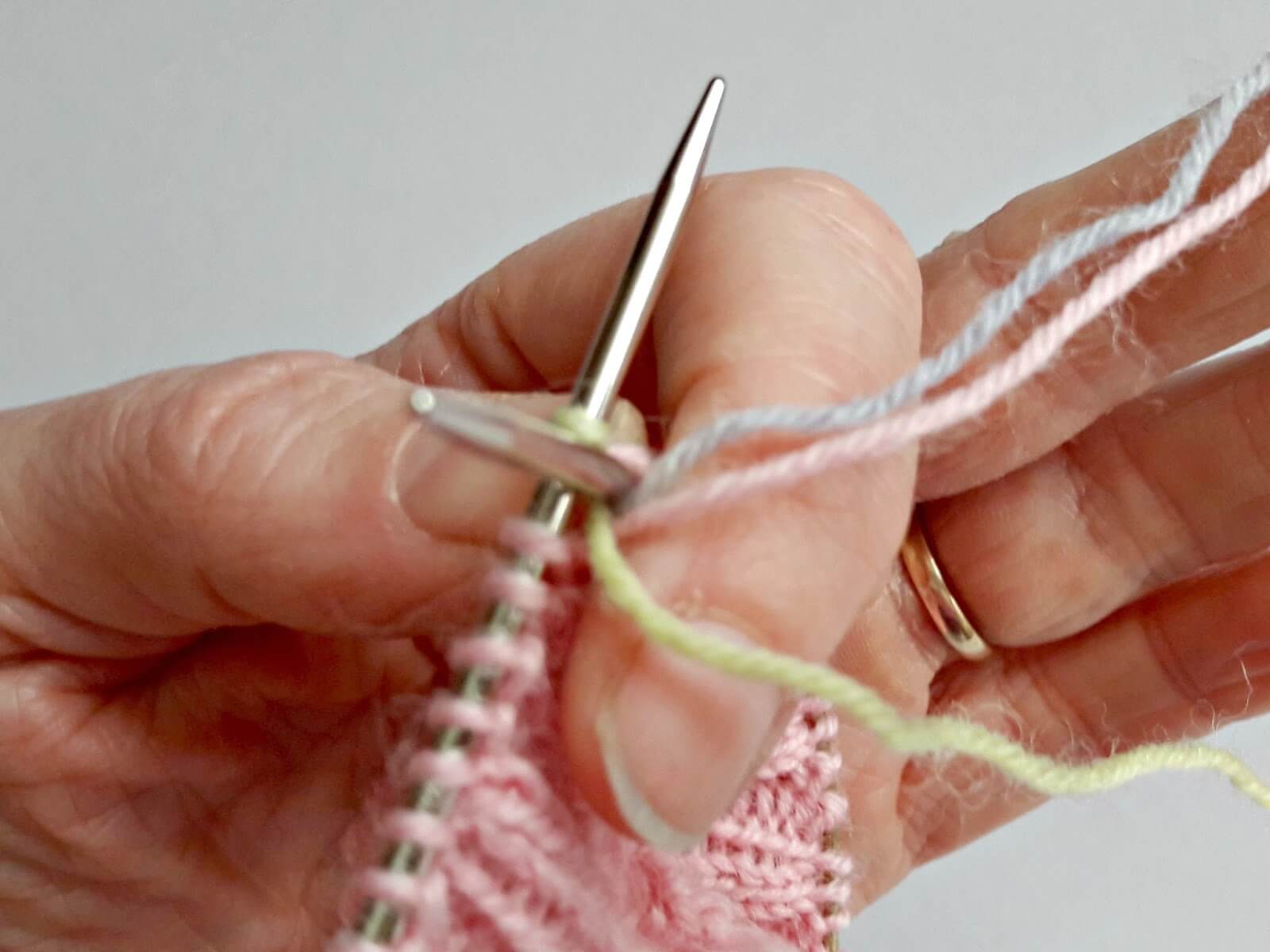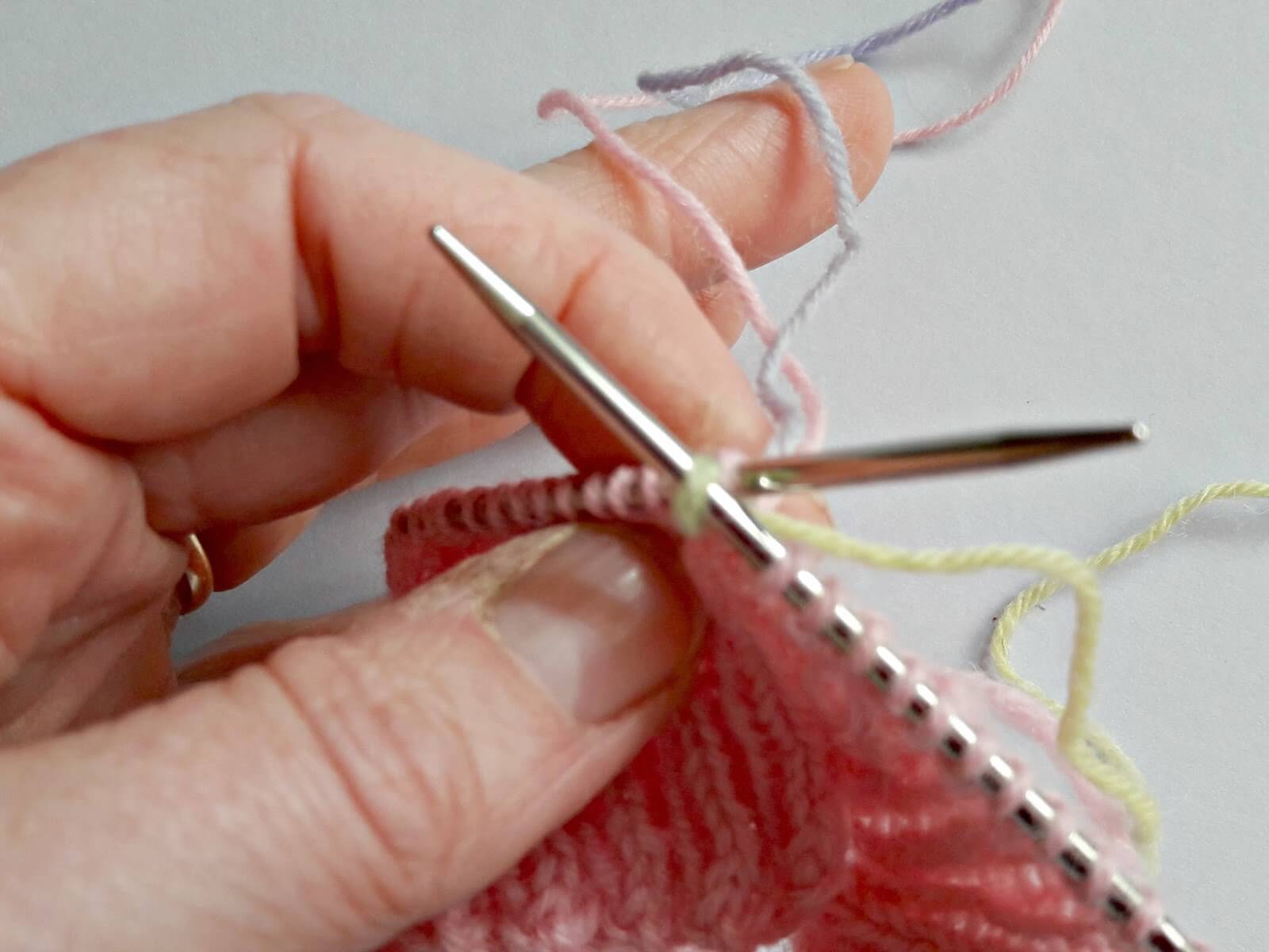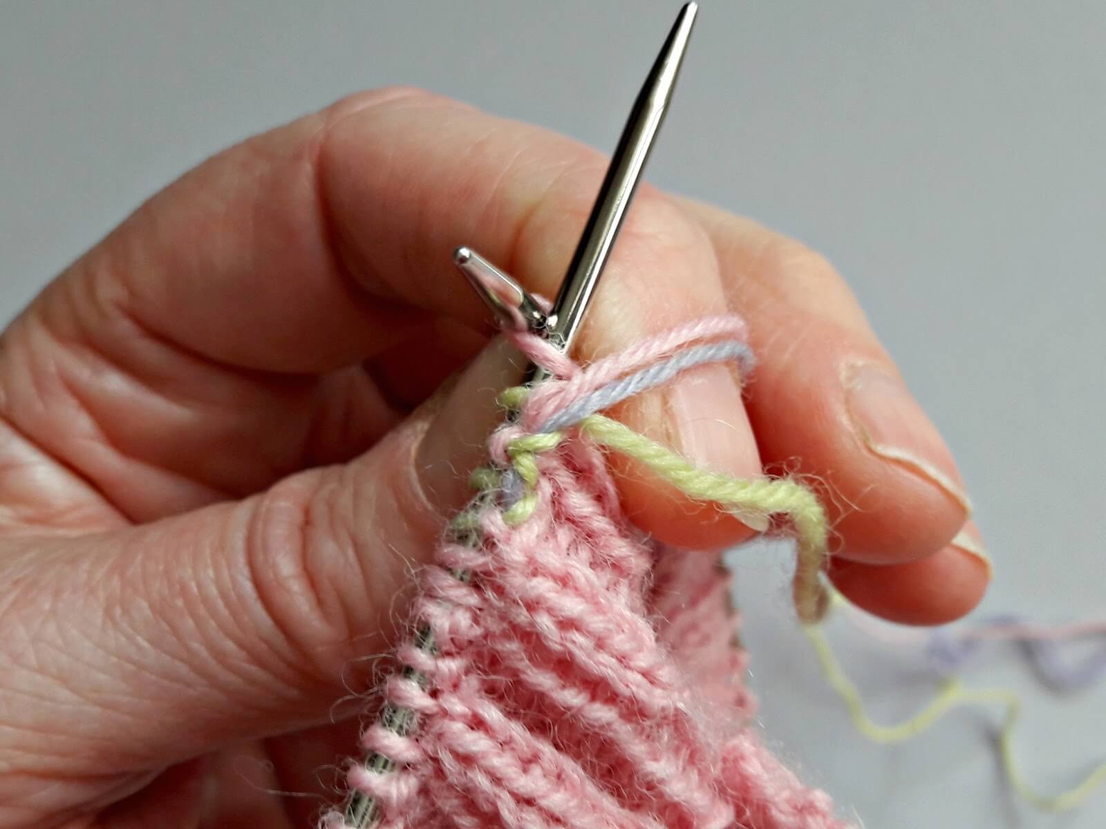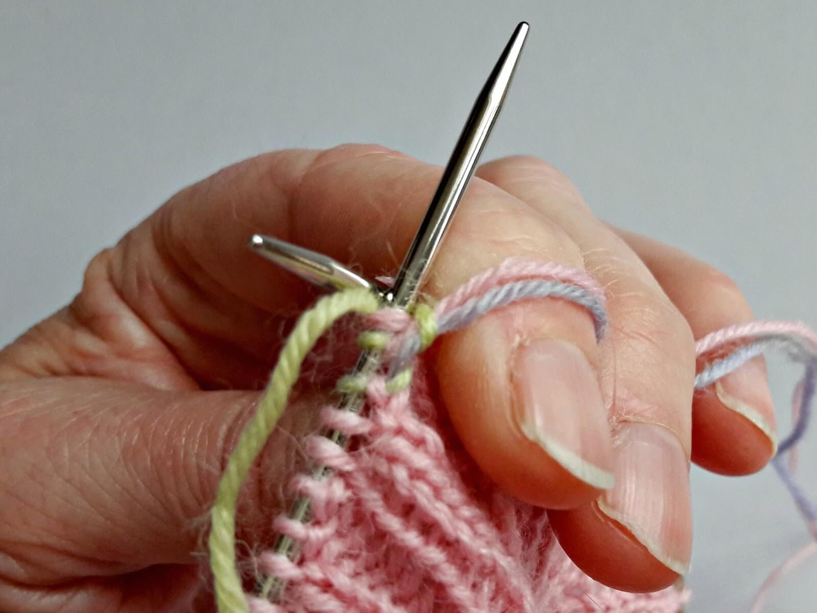 Now we’re going to start weaving the yarn as we knit the stitches. In this next picture, you can see that I’ve got the green working yarn over the top of the pink contrast yarn, and next to the pink yarn is the purple end of the new working yarn. We’re going to weave both of those in together. Don’t worry if it seems a bit confusing at the moment, it’ll make sense in a minute!