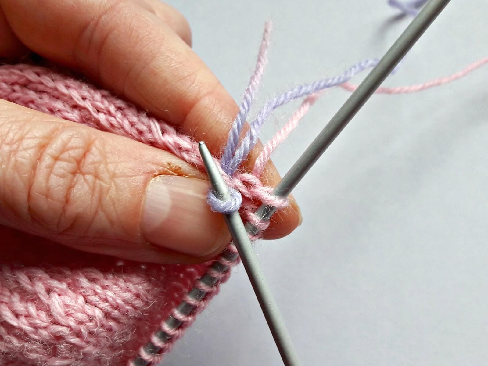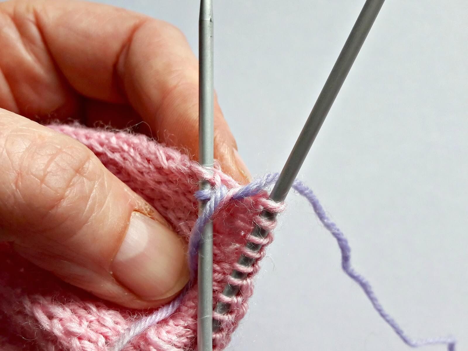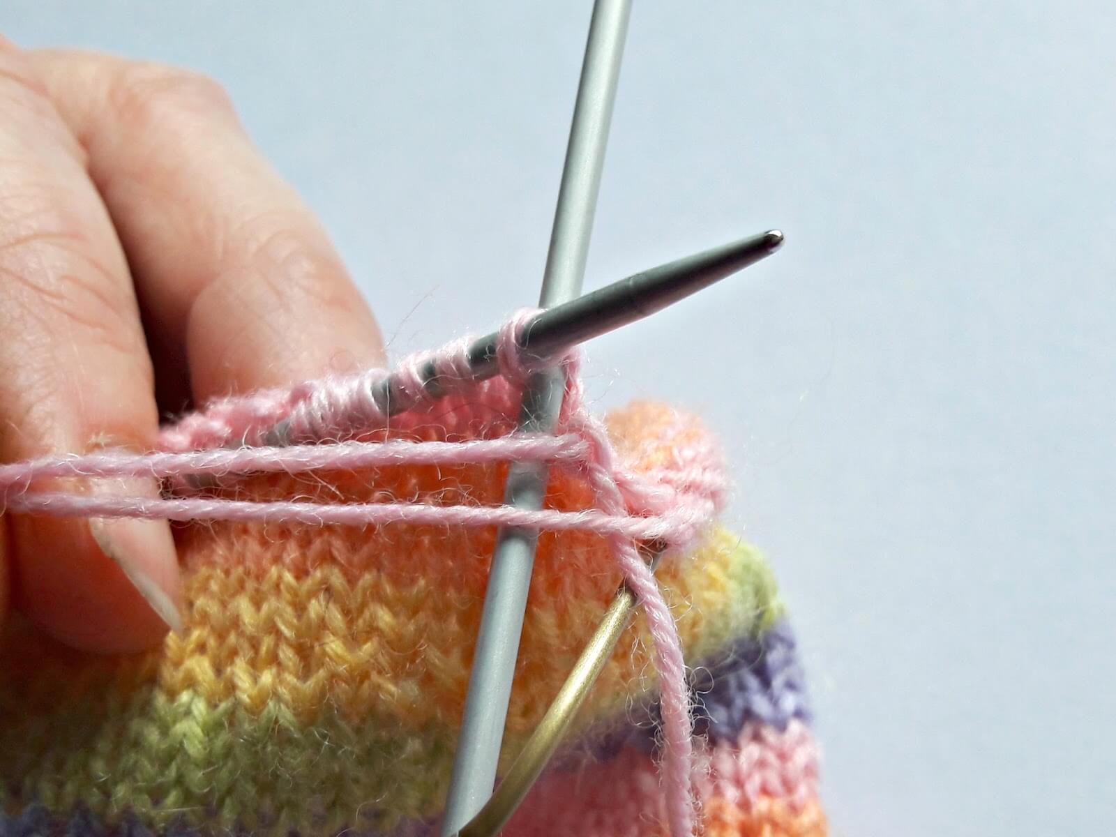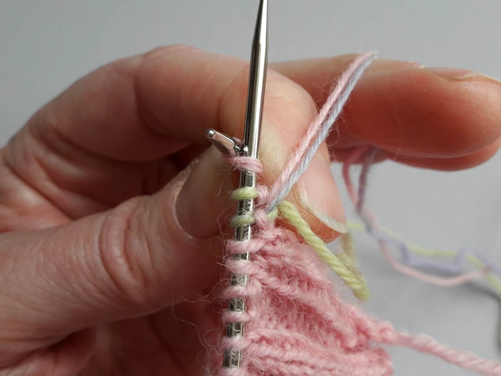 Now we’re going to start weaving the yarn as we knit the stitches. In this next picture, you can see that I’ve got the green working yarn over the top of the pink contrast yarn, and next to the pink yarn is the purple end of the new working yarn. We’re going to weave both of those in together. Don’t worry if it seems a bit confusing at the moment, it’ll make sense in a minute!