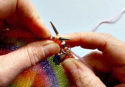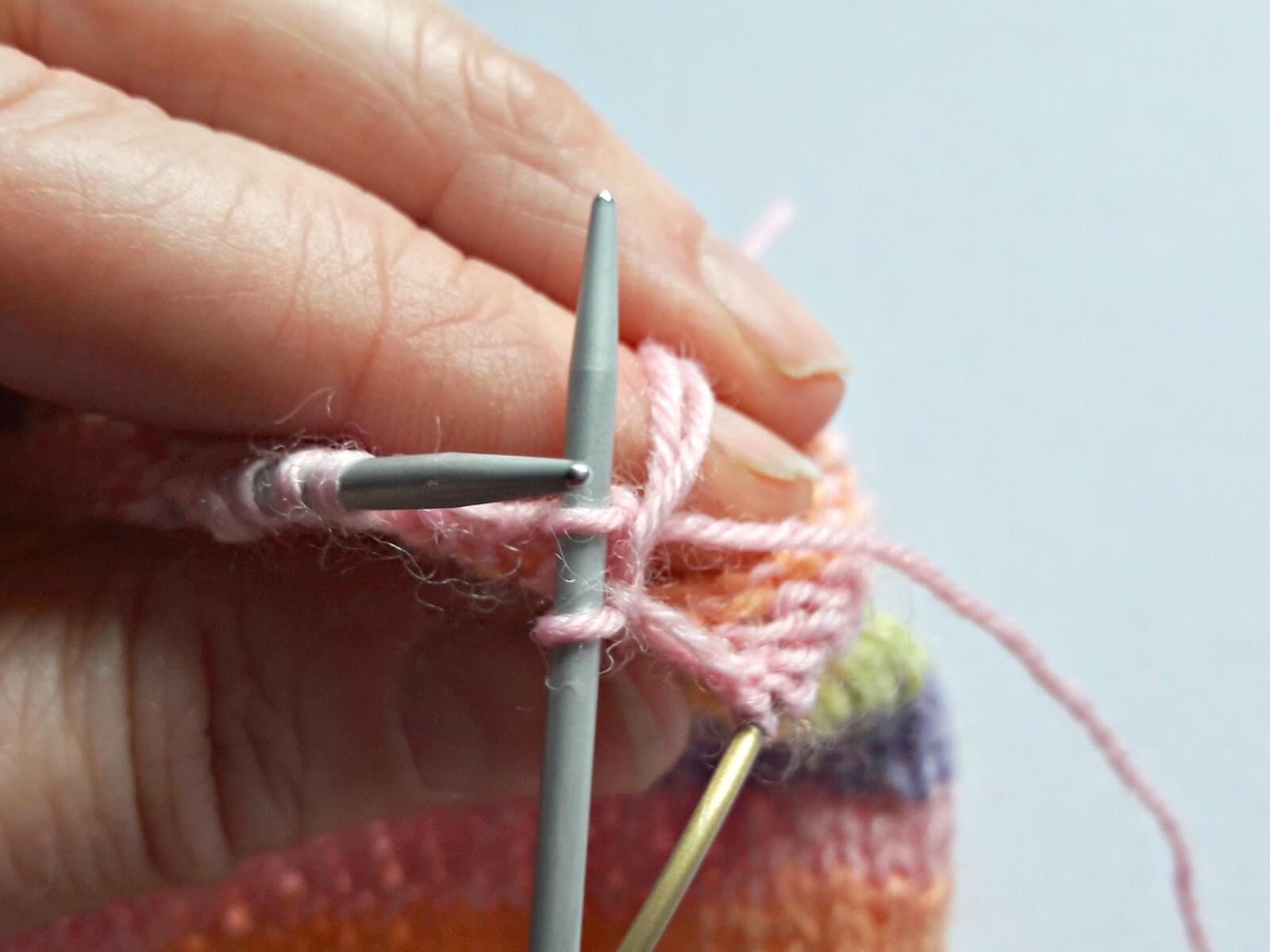 ** NOTE ** Depending on the yarn you use, sometimes there’s an obvious “big stitch” where you’ve wrapped the two yarns behind your knitting. Often, you can deal with this by pulling the stitches on the right side with a wool needle to even out the stitches, but if you’re using yarn that just won’t play nicely, you could wrap the two lengths of yarn on different rounds – one on the first round and one on the second round – and that will solve the problem.