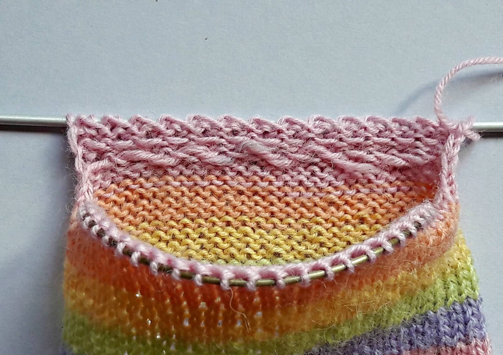- Leave the yarn where it is ready to pick up the second set of gusset stitches, but if you do that then the first set of picked up stitches and the top of the foot stitches will be knitted in the same colour as your heel flap until you get round to where you can pick up the main colour again. That wouldn’t be a problem on the sock I’m making as it’s all the same pink colour, but if you’re using a completely different colour then it might look a bit odd.