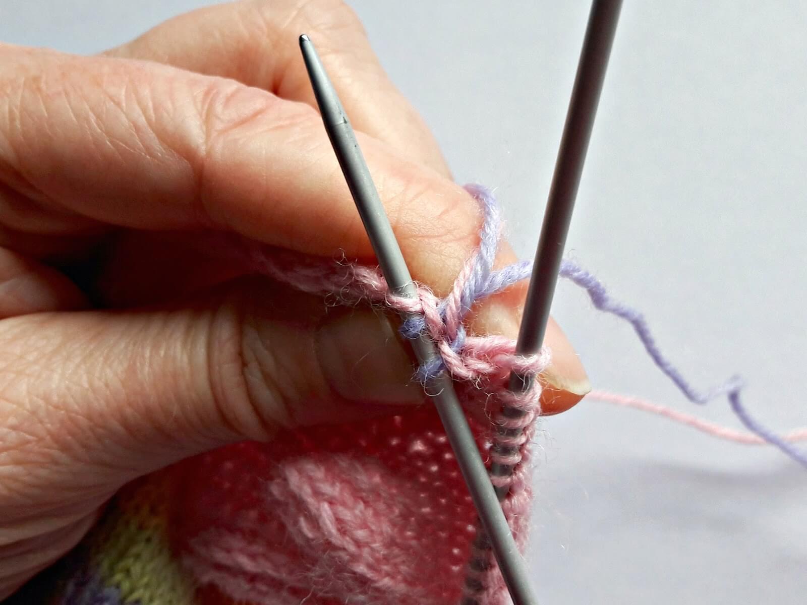 and then catch the “old” yarns under the working yarn for the next knit stitch.