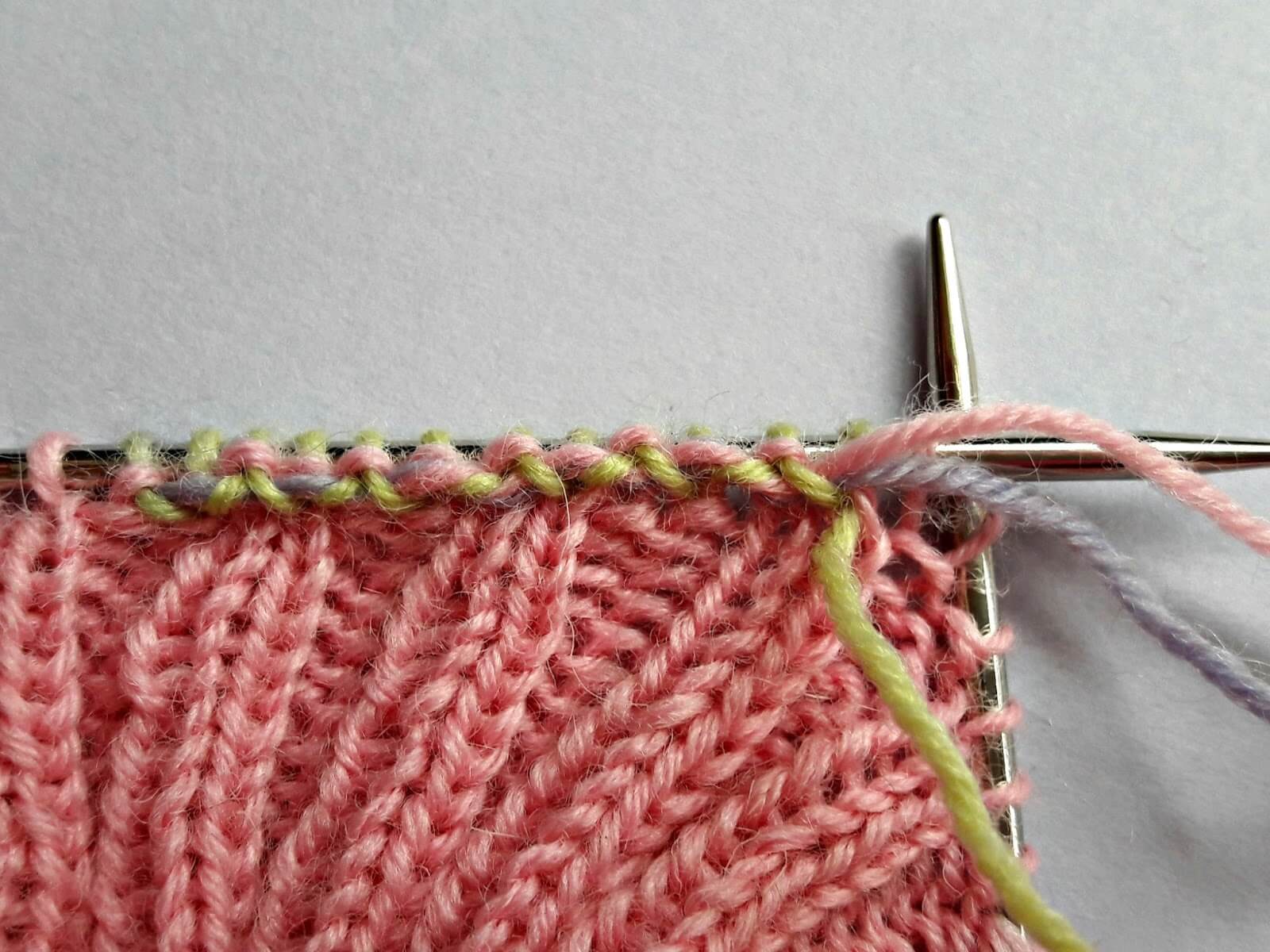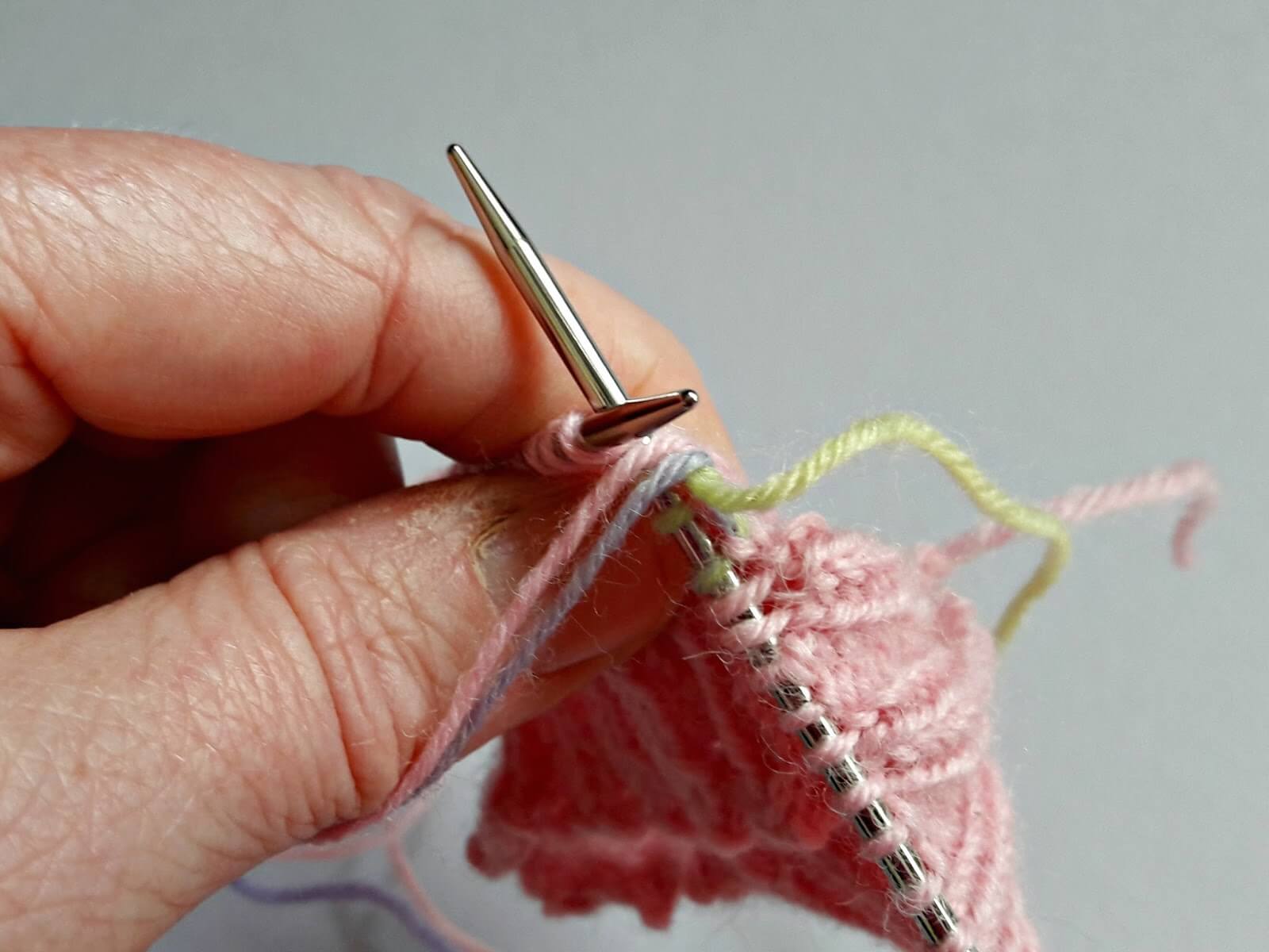 Now bring the pink and the purple “old” yarns over the top of the green yarn so that when you make your next stitch, the green yarn secures them.