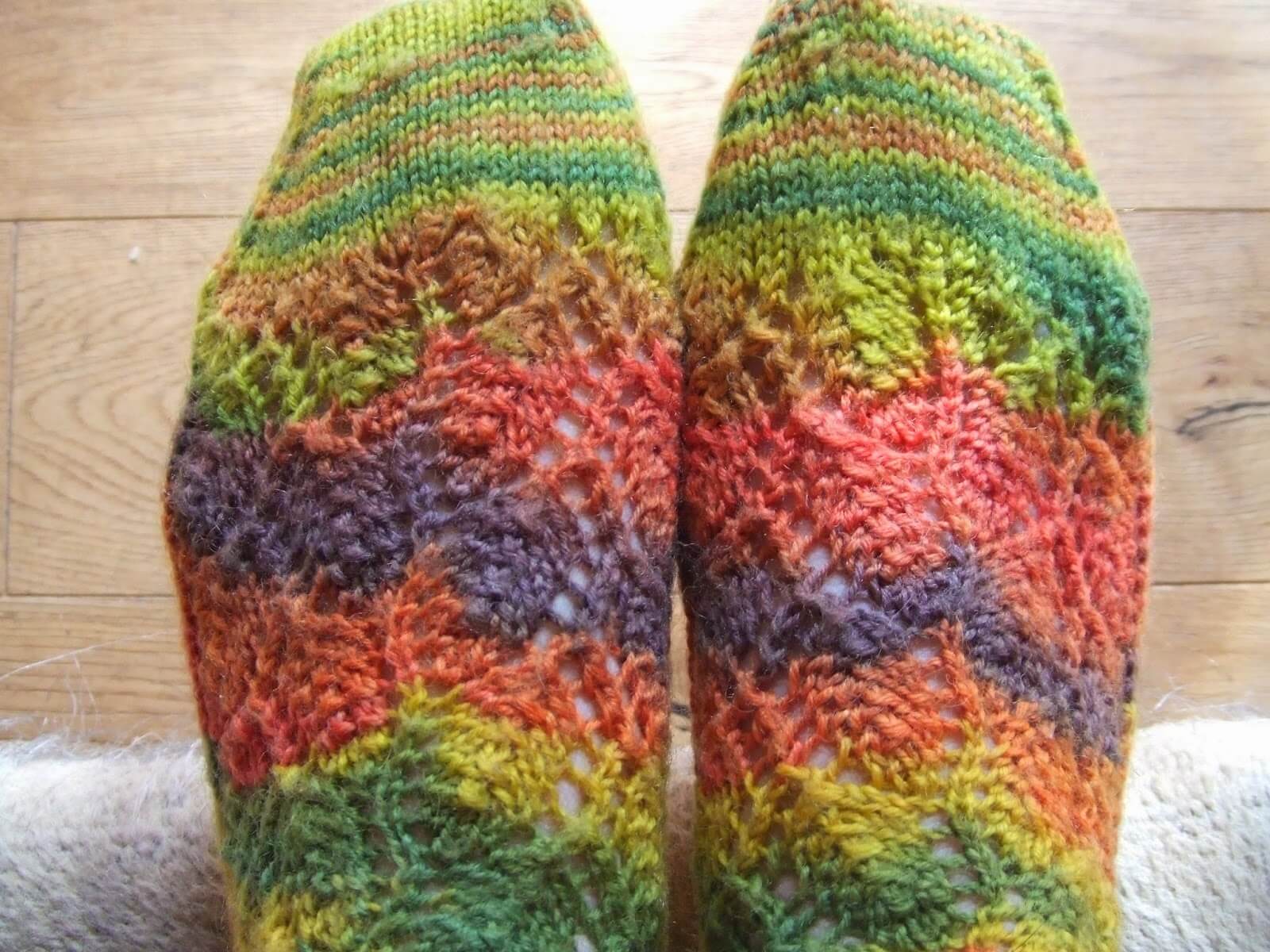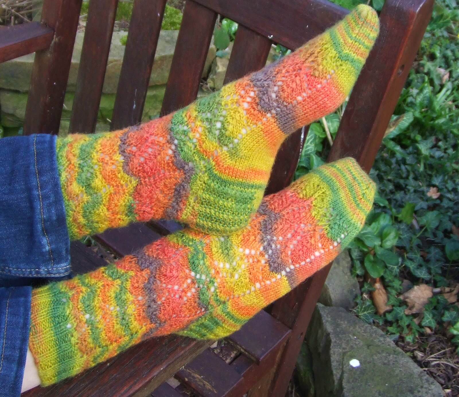 What wonderful colours and the pattern is super. I however, won't be trying it as I find it difficult enough to do a plain sock, never mind the pattern as well. Still, it is lovely to look at yours. I'm thinking of taking a sock course, hopefully if I am able, I might be a bit more confident. I'm wearing a pair of my own socks but as they were the first ones I did, they are rather baggy.