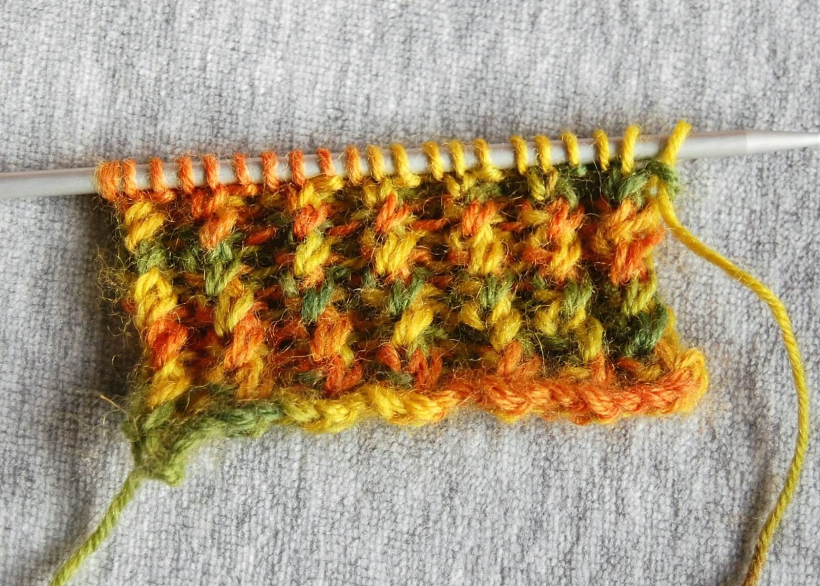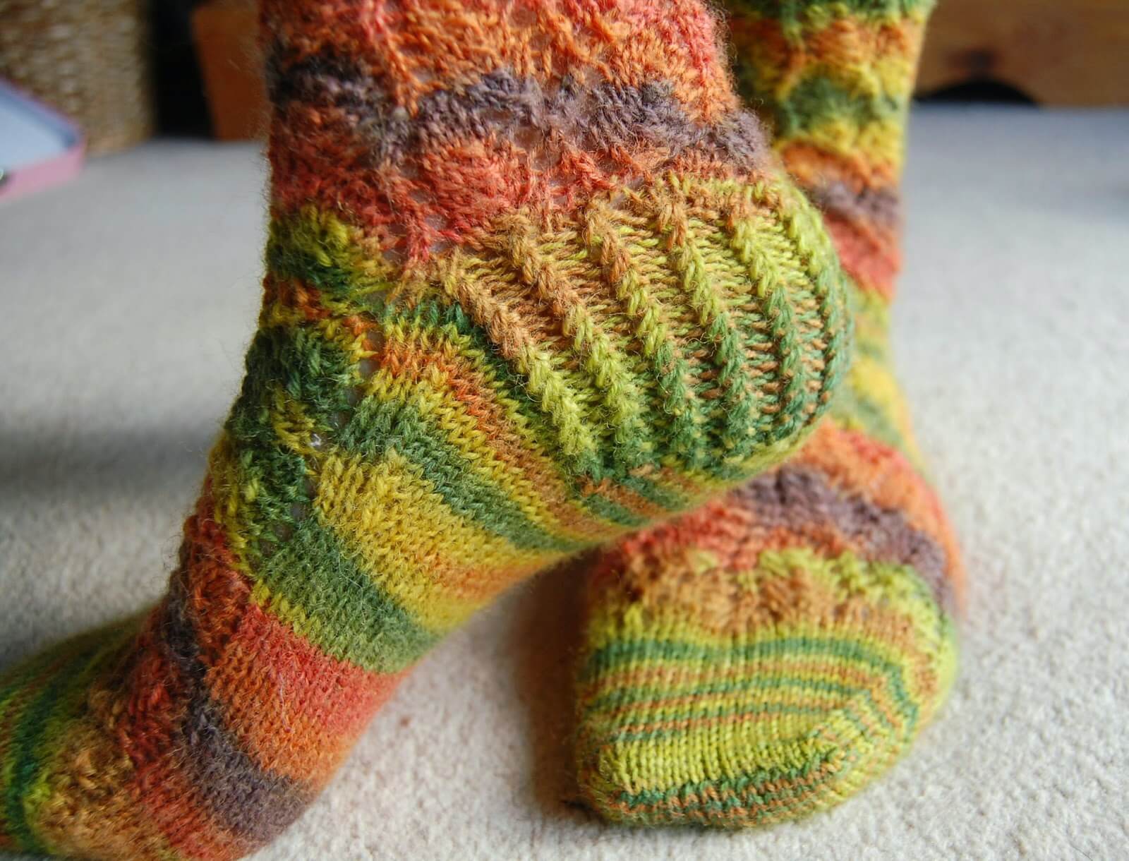 The colours make me think of autumn leaves, and the cross-stitch rib on the heels is a great alternative to the functional but rather boring heel stitch.