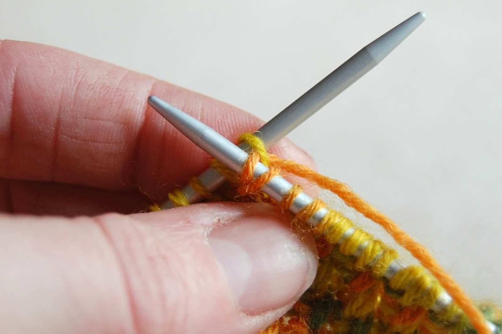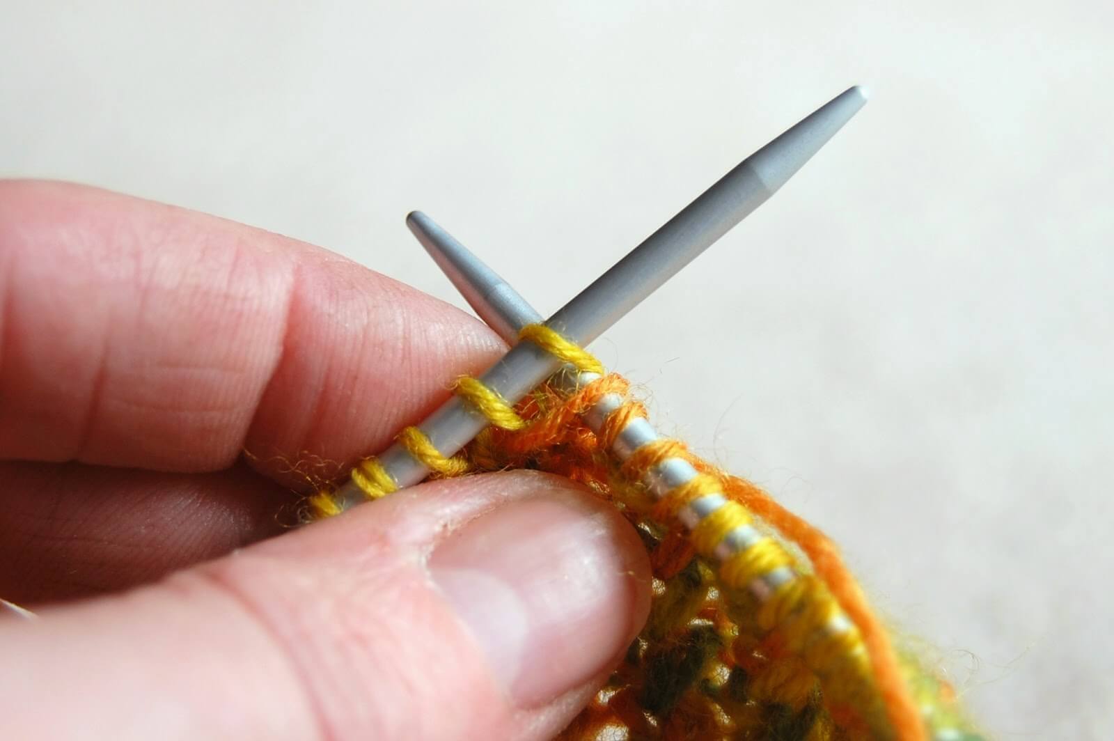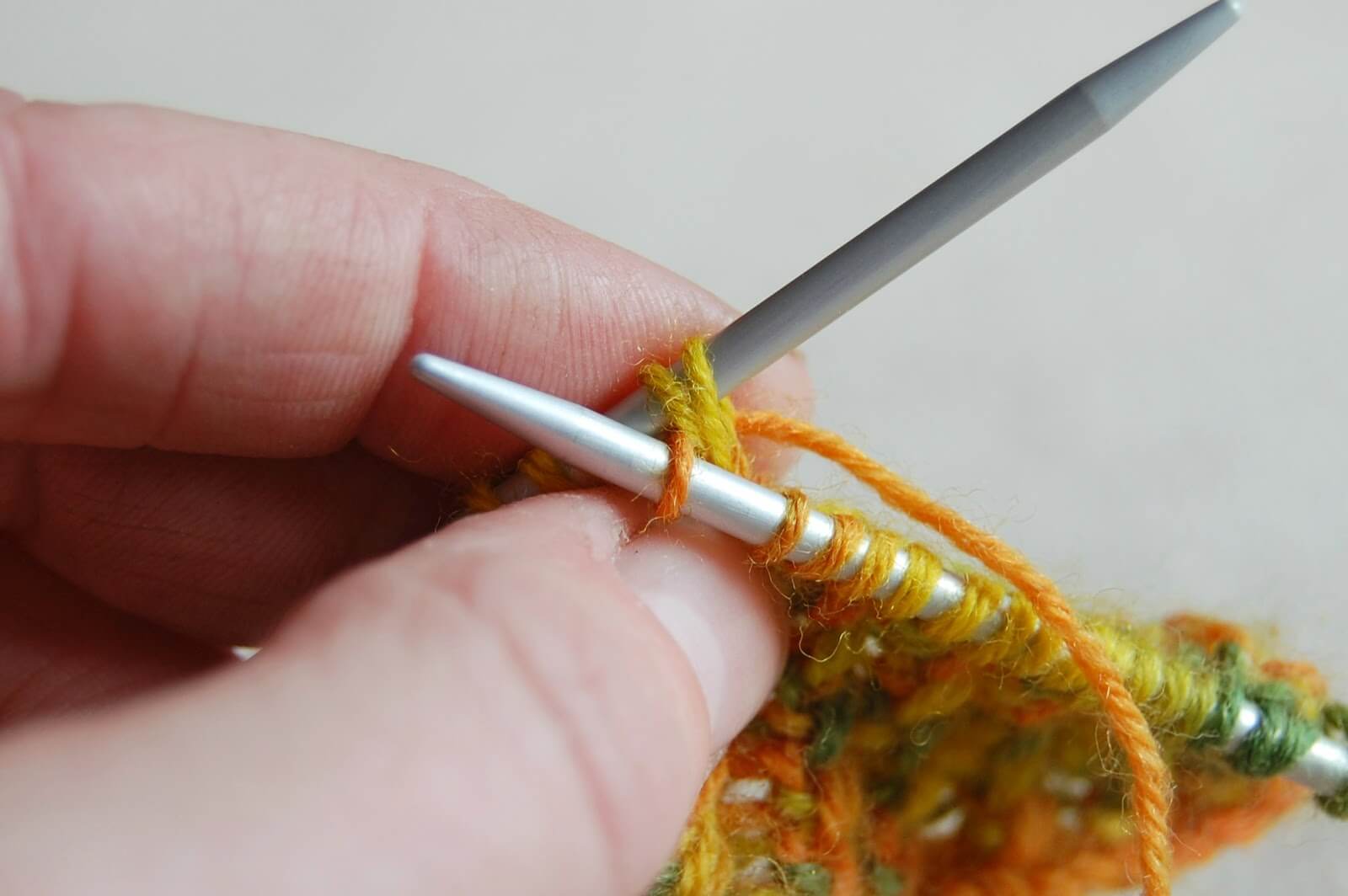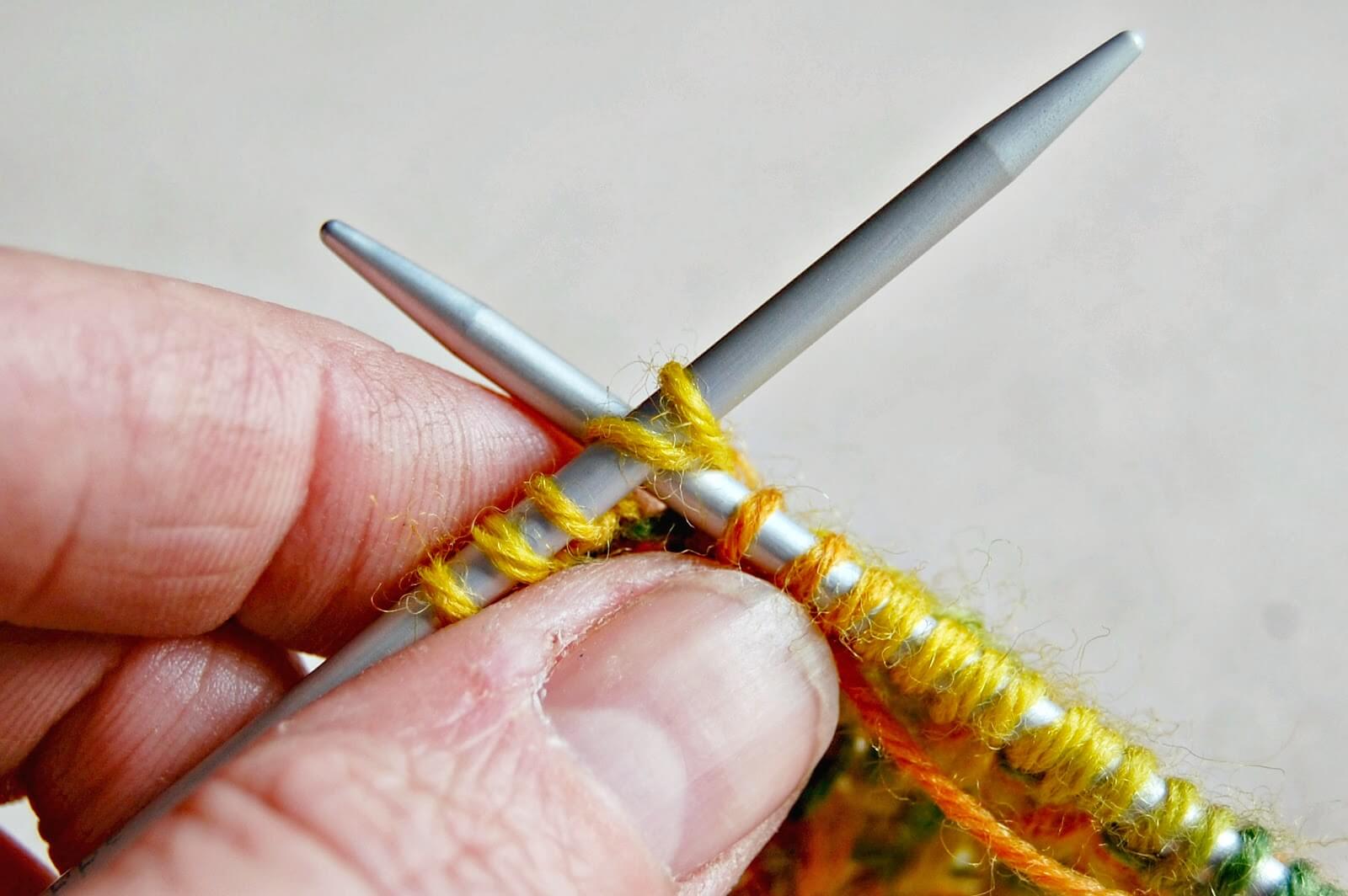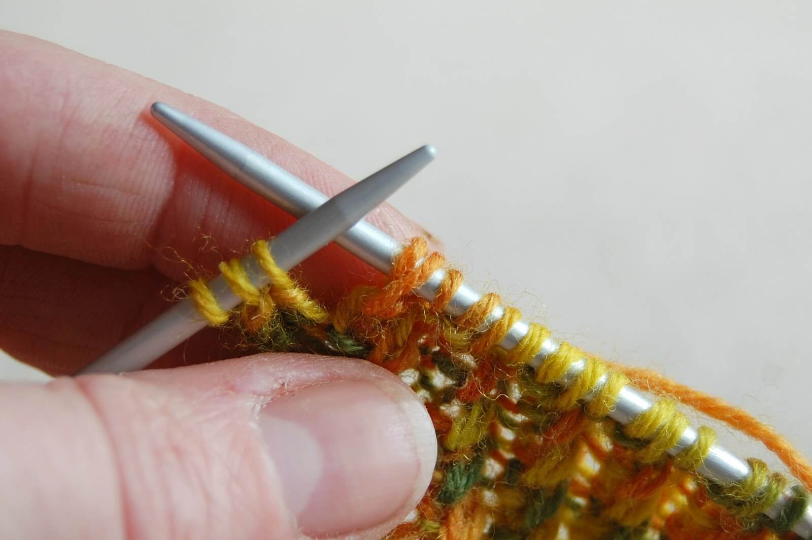 3 Put your right hand needle knit-wise into the first stitch on the left hand needle. You can see how the other stitch pulls across. Don’t let it get too loose, but equally you don’t want it too tight or you won’t be able to move your needle.