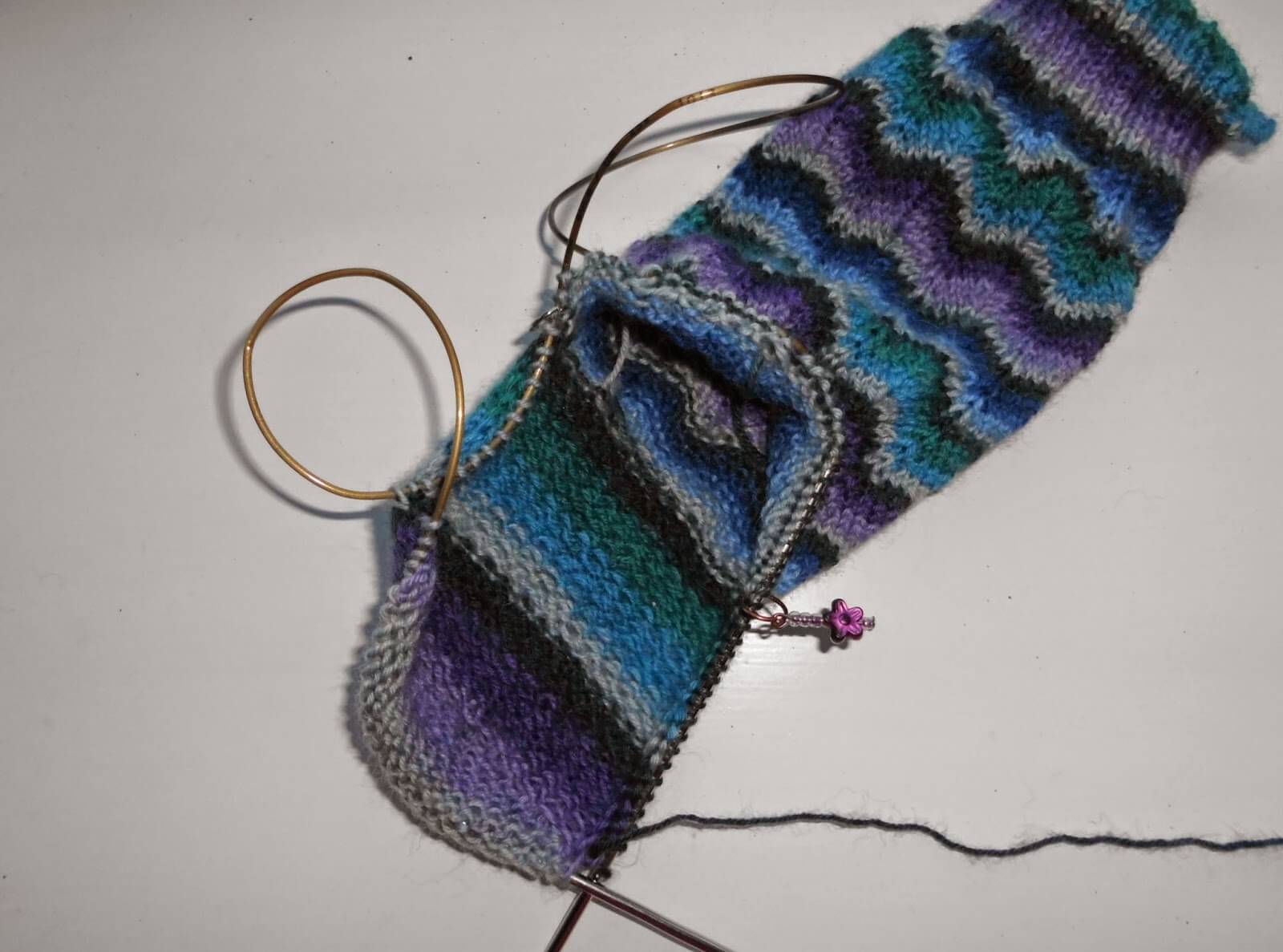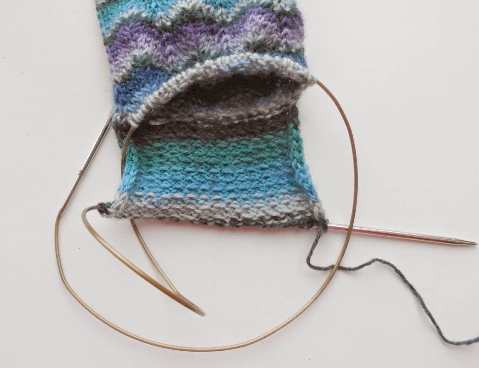 The handy thing about using the magic loop method is that you can keep all of your stitches on one needle whilst you’re creating the heel flap!