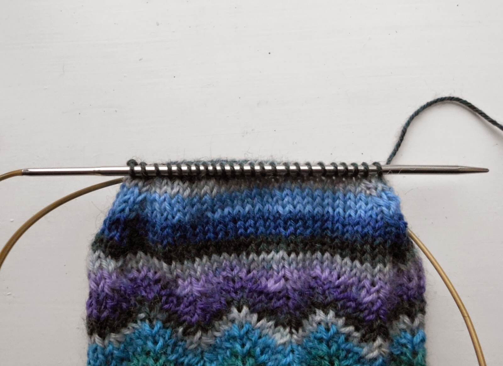 At this point, change to the 2.75mm needle for magic loop or divide the stitches evenly across three or four DPNs according to preference and join into a circle, place marker. If you prefer, you can knit the whole of the rib on the smaller needles and change up for the pattern.