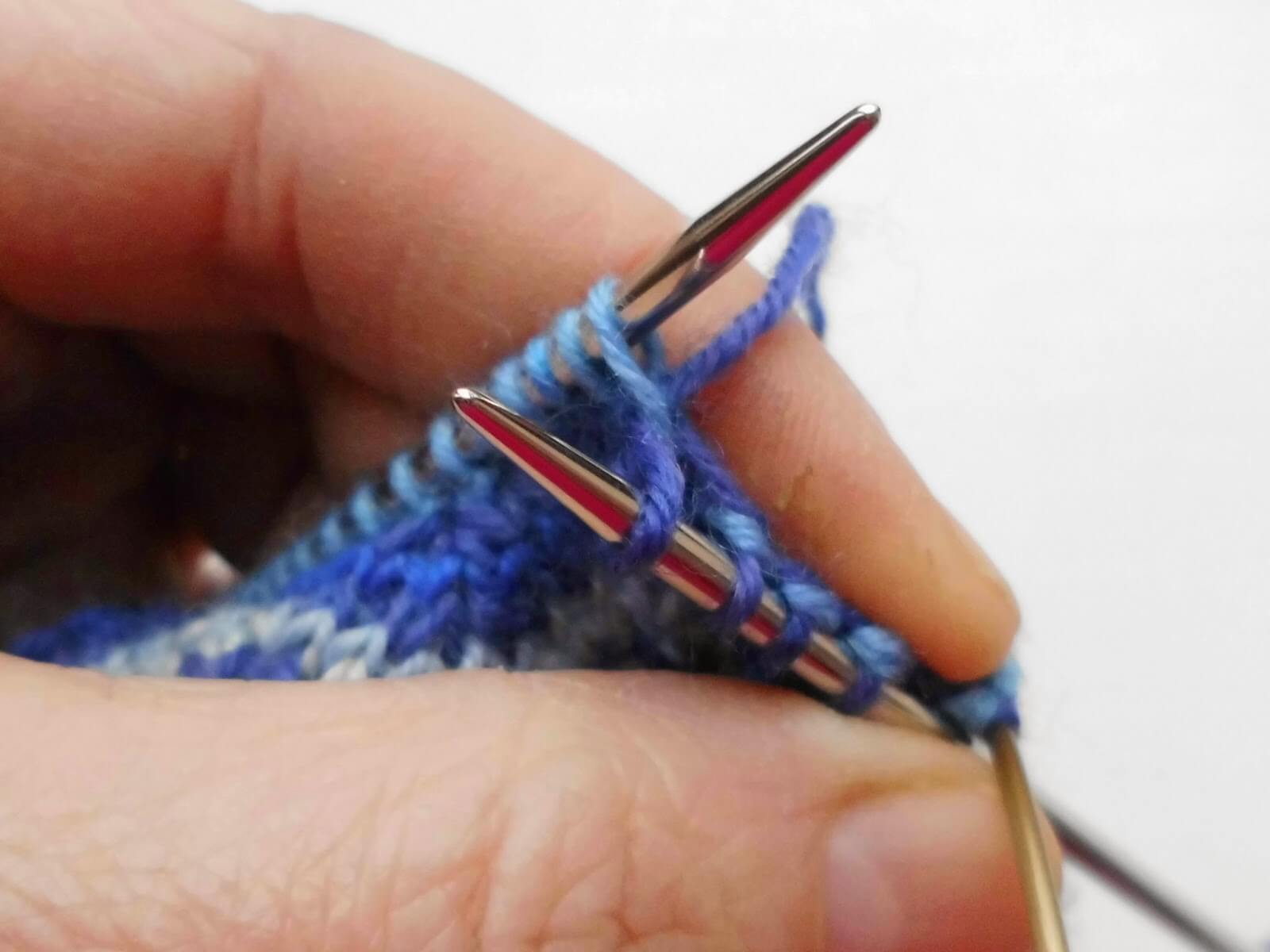 I made the hills of the ripple using kfb. This is an increase stitch which you create by knitting into the front and the back of the same stitch. Like this …