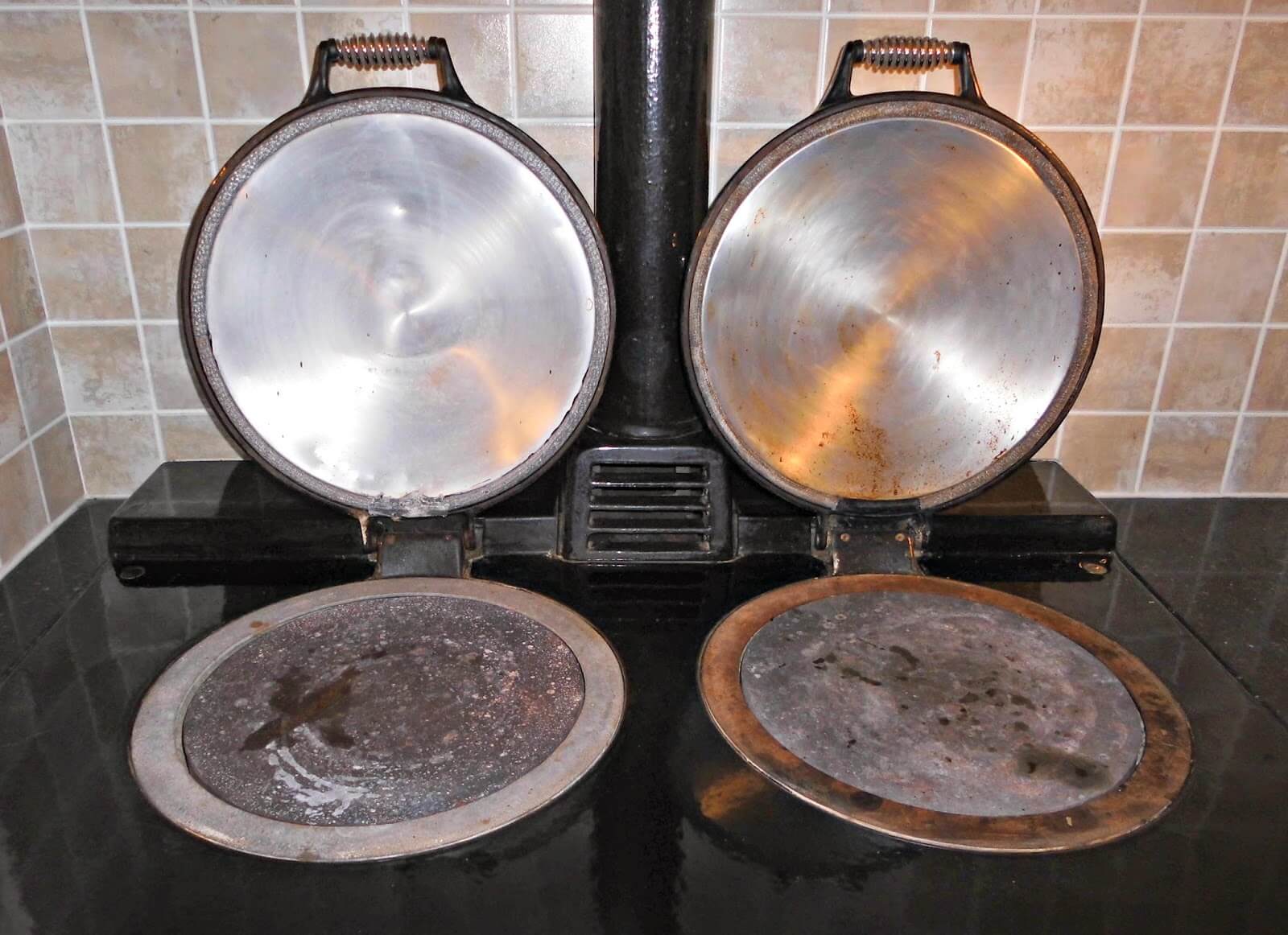 The left hand hotplate is called the boiling plate. It’s right above the burner so it’s the hottest part of the Aga. It brings pans and kettles to the boil very quickly and makes fabulous toast. The right hand hotplate is called the simmering plate. It’s cooler than the boiling plate and ideal heat for making Scotch pancakes. I have a piece of non-stick parchment called Bake-o-glide which is cut to the right shape for various Aga tins including the simmering plate. This means that I can cook straight onto the hotplate without worrying about the mess. It’s brilliant for frying eggs without any fat – we call them flat eggs because they’re not actually fried at all!