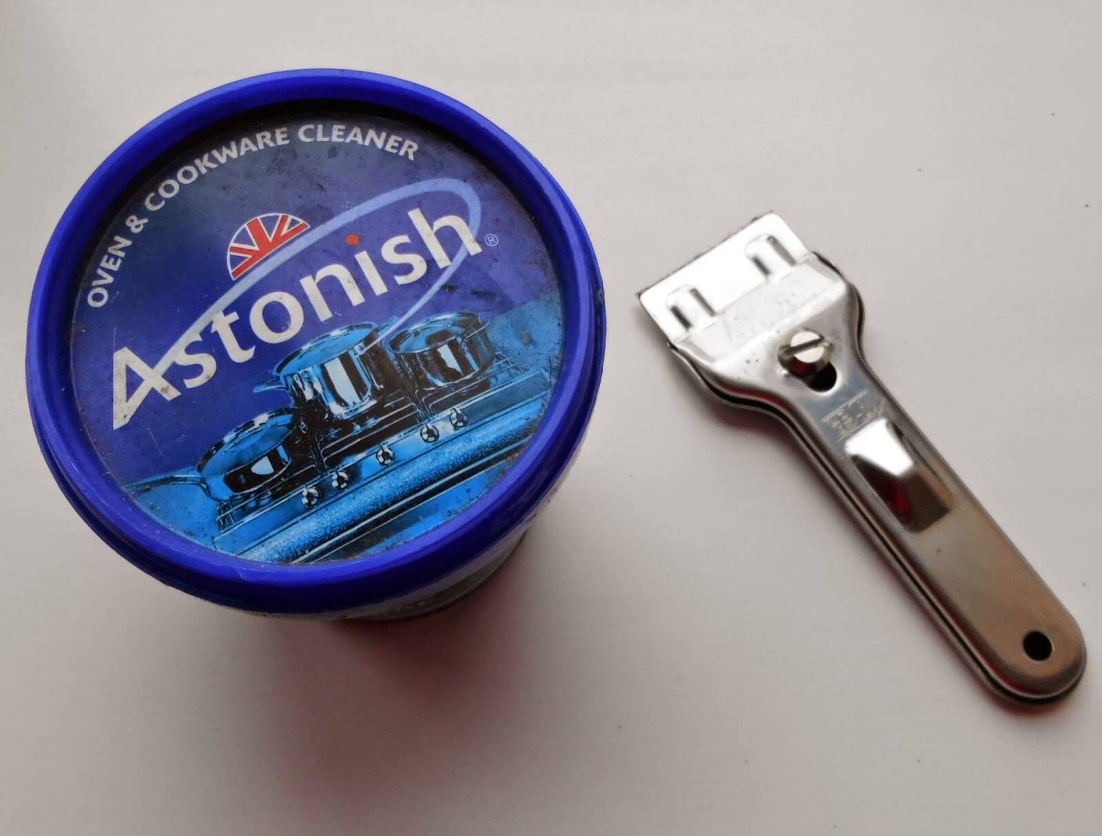 This is what I use on the rest of the enamel: Astonish paste and this nifty little scraper which removes the burnt-on grease without scratching. I wasn’t convinced about it at first, but once a lady at an Aga shop showed it to me and I realised it wasn’t going to damage my beloved Aga, I found that it did indeed make light work of the cleaning!