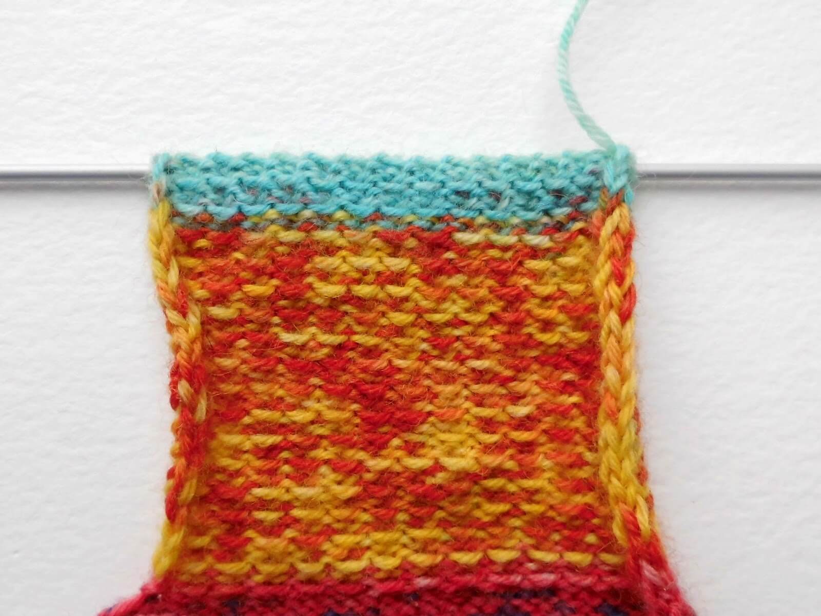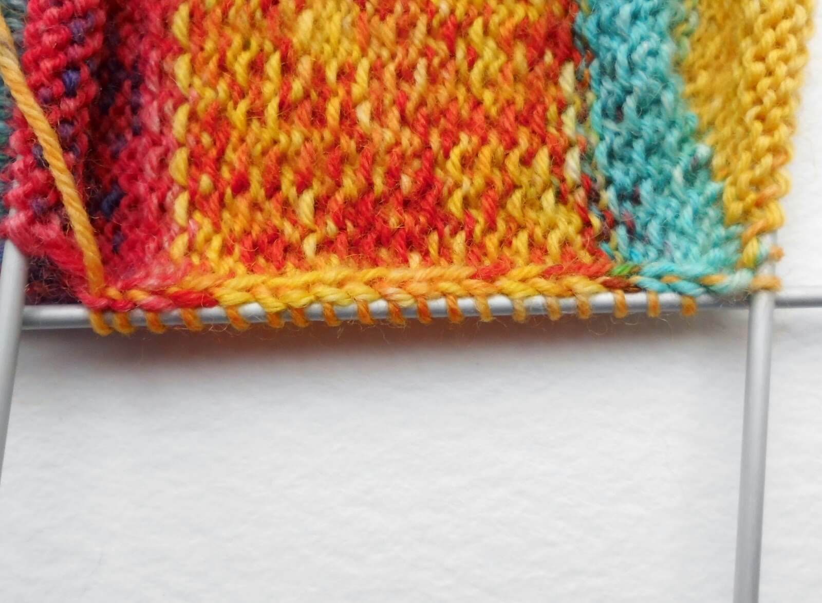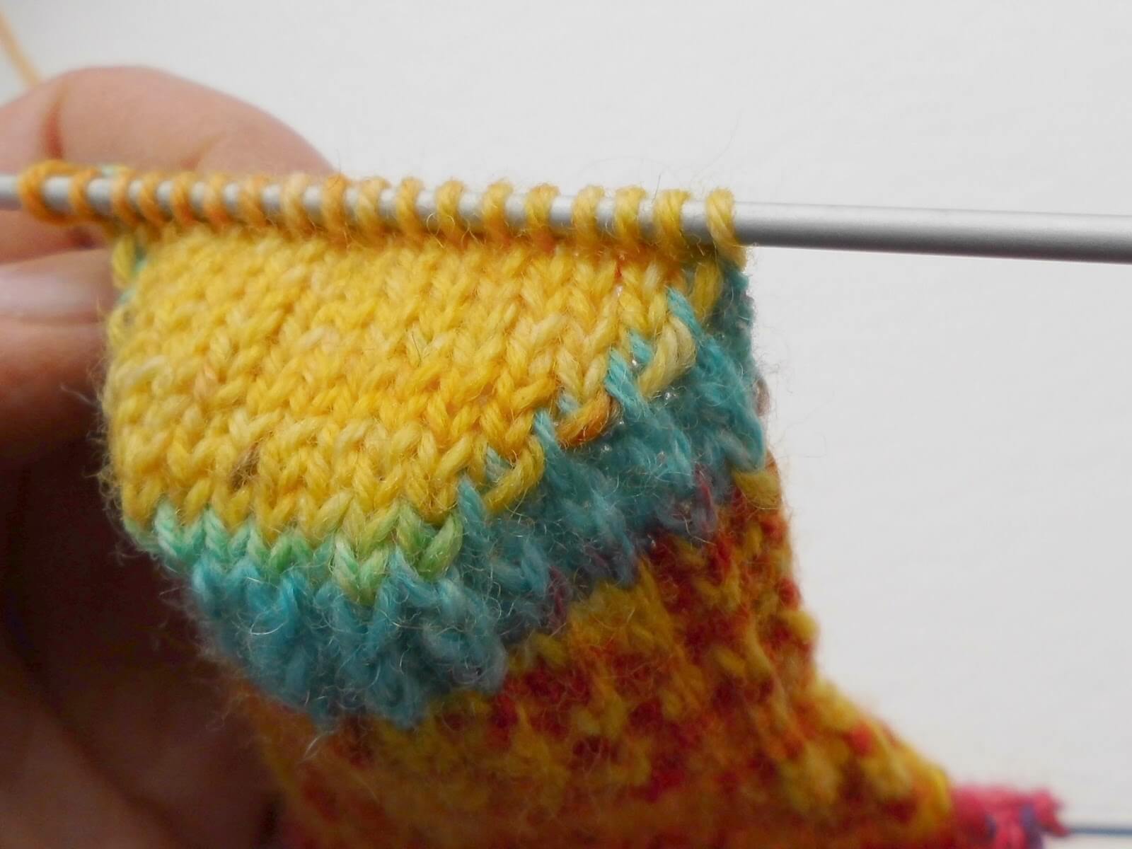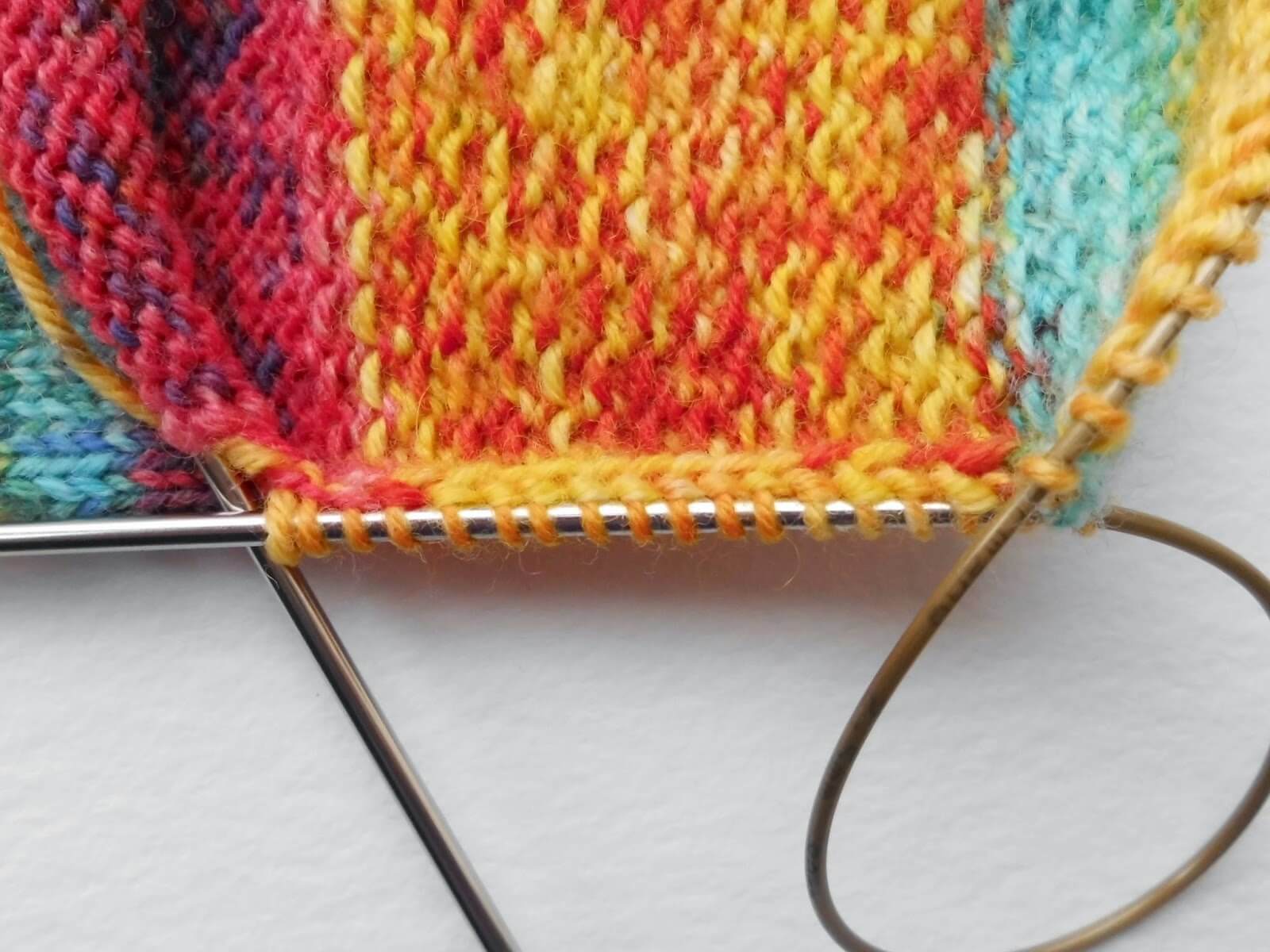 – The larger slip stitch is to make it easier for your to pick the stitches up when you start the gusset. They shouldn't be too big – if so, next time check that you're not letting your yarn be too loose at the end and start of the row – and they should tighten up as you wash and wear your socks.