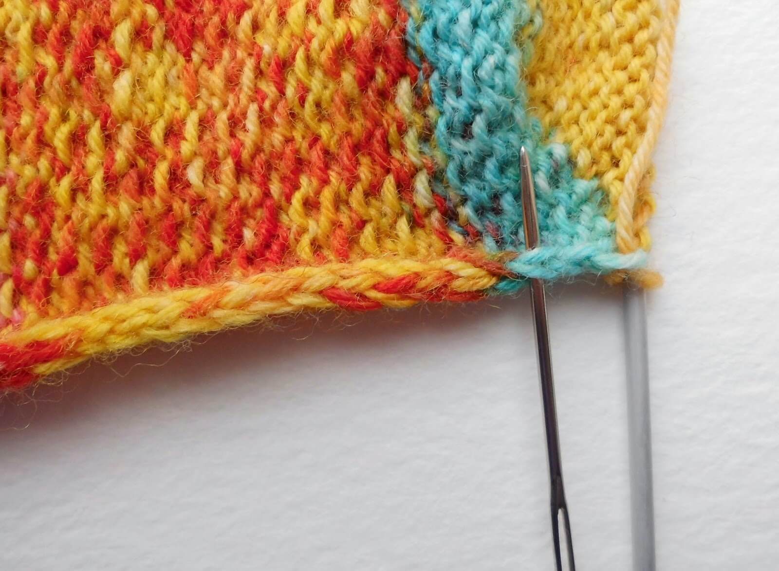 We do this by first picking up stitches from the heel flap. This is quite easily done, even if picking up stitches isn’t your favourite thing to do. Do you remember that you slipped the first stitch of the heel flap on every row? That slip stitch is what’s going to help you pick up the stitches because it creates a slightly bigger loop for you to knit into. You can see in the picture the stitch is indicated by the wool needle.