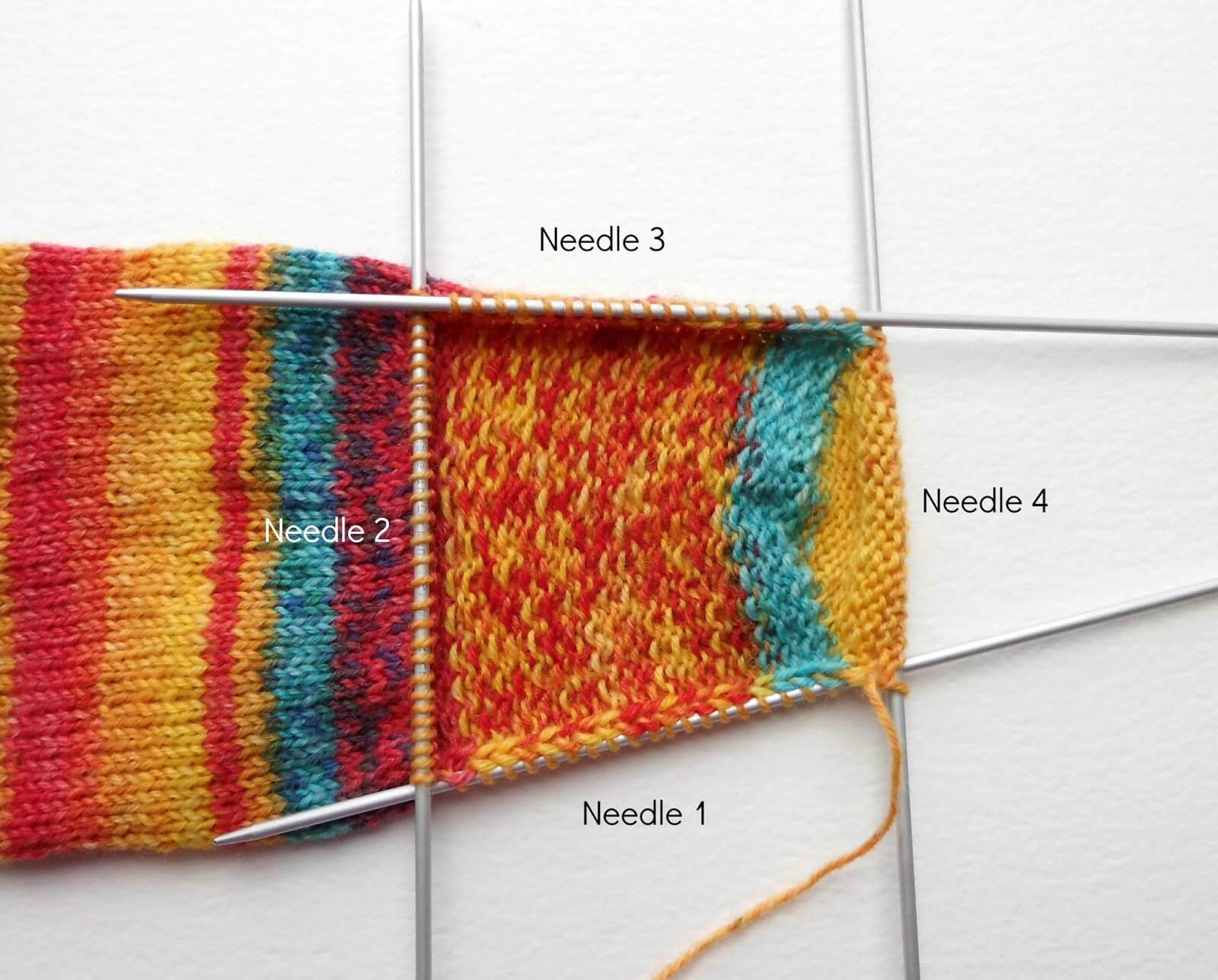 If you are working on 4 needles, you will need to have all of your stitches distributed across 3 needles which might feel a little bulky until you start decreasing them. After completing the heel turn, pick up 19 stitches with Needle 1, knit across 30 stitches for the top of the foot with Needle 2, pick up 19 stitches with Needle 3 plus 9 stitches from the heel. Knit the next 9 stitches plus the 19 picked up stitches originally held on Needle 1 and this will become your new Needle 1 – don’t forget that you will need to decrease (K2tog) 3 stitches before the end of Needle 1 on this round (round 1 of the gusset decrease). Continue to work rounds 1 and 2 of the gusset as above until you have 60 stitches on your needles.