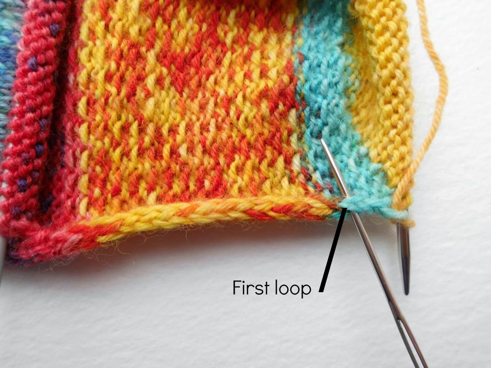 Tip: if you think you are going to have a big gap between the end of your picked-up stitches and the first of the stitches held on your circular needle, pick up an extra one or two stitches as required in the gap.Don’t worry about the extra stitches as you will just decrease them as you go along.