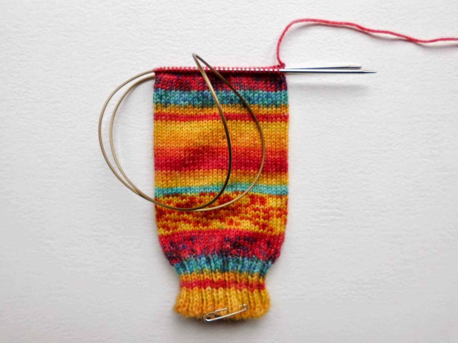At this point, you can tuck the ends of your circular needle down inside the tube of your sock leg to keep them out of your way.