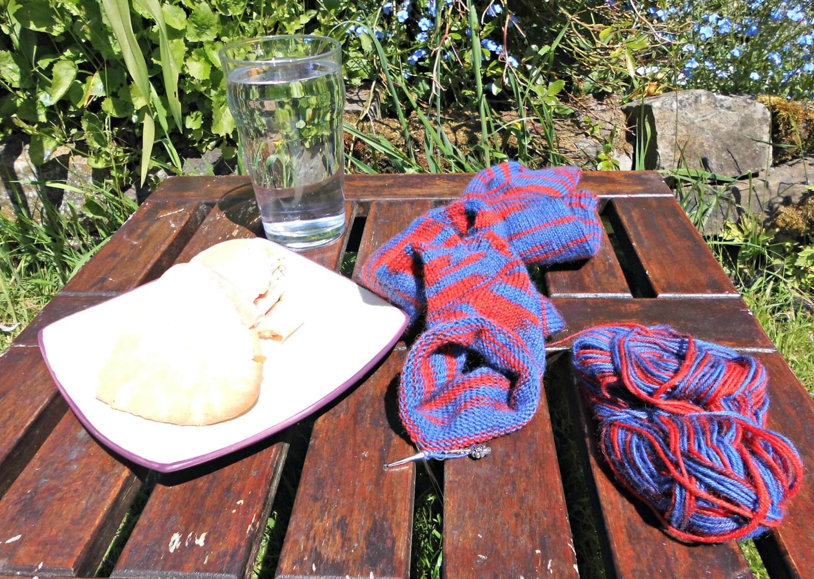 I took my lunch outside today as well – ham salad on pitta bread with coleslaw. I’ve taken quite a fancy to pitta bread stuffed with various fillings recently – it seems so much more exciting than plain old sandwich bread. I’ve no idea how long this nice weather is going to last for so I’m trying to spend as much time outside as I can. This little wooden table is just about all that’s left of our old garden furniture and is just the right height to put your feet up on whilst you get into the knitting groove. I thought you’d rather look at my nearly-finished socks than my feet, though J.