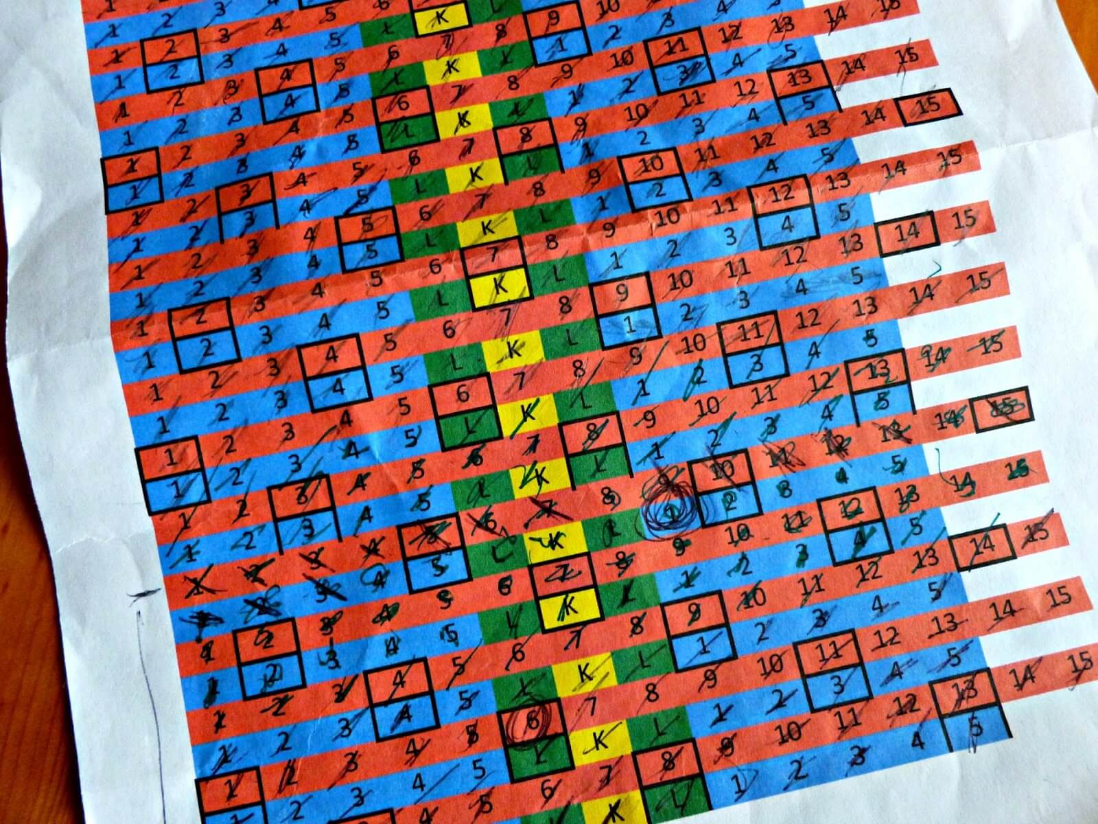 You’re going to continue knitting your shawl, but don’t worry too much about keeping track the number of knit and purl stitches on each row – what’s more important is that you follow the chart as set, increasing and decreasing as required until are almost at the end of your yarn. If you use the tick-off decrease chart it’s easy to see where you’re up to.