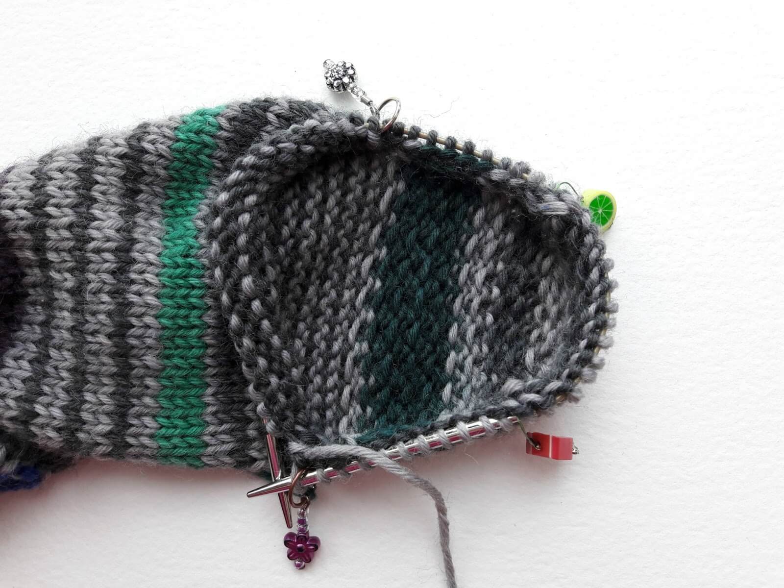Once you have knitted across your heel turn stitches, place another marker over your needle (mine’s a strawberry this time!)