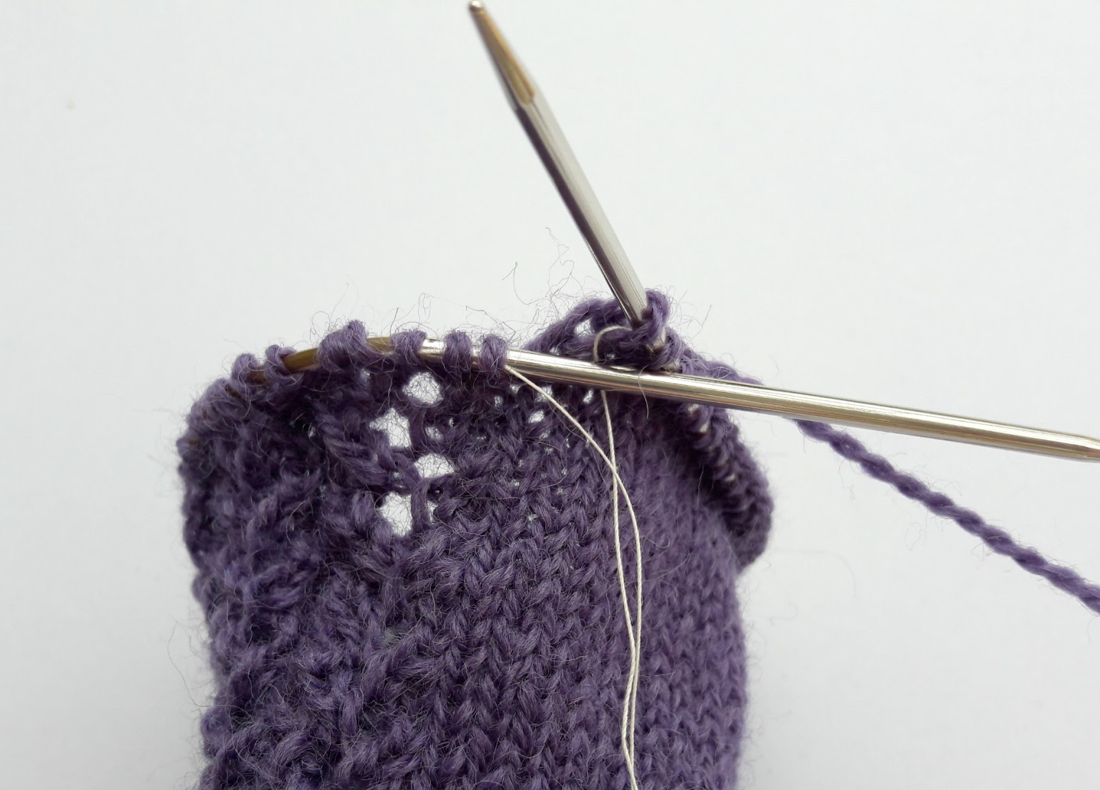 Thread your wool needle with a length of the cotton and thread it into the stitches on your needle. Try to go right through the stitch rather than catching the yarn, and take the thread right around your sock.