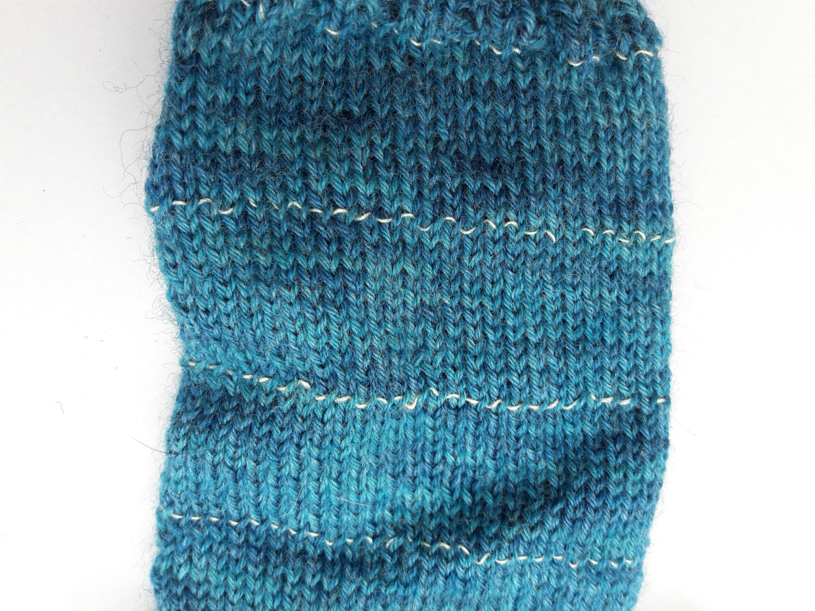 There’s no limit to the number of lifelines you can have; just put them in wherever you feel comfortable. This sock is one that I’m working on with a ten row lace pattern and I’ve put a lifeline in at the end of each pattern block.