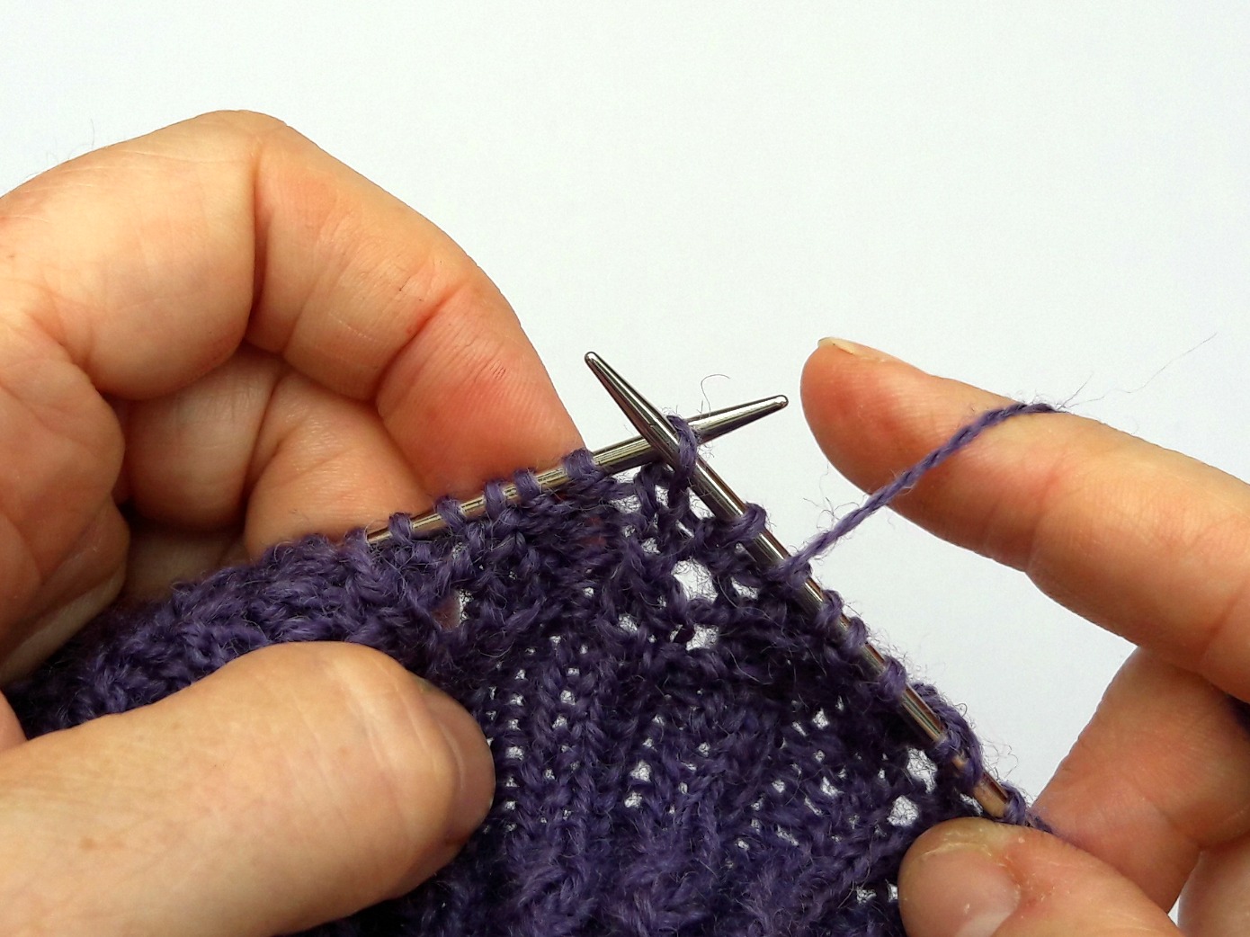 3 Wrap the yarn around the needle in an anti-clockwise direction, so that it’s back in the right place for you to knit the next stitch …