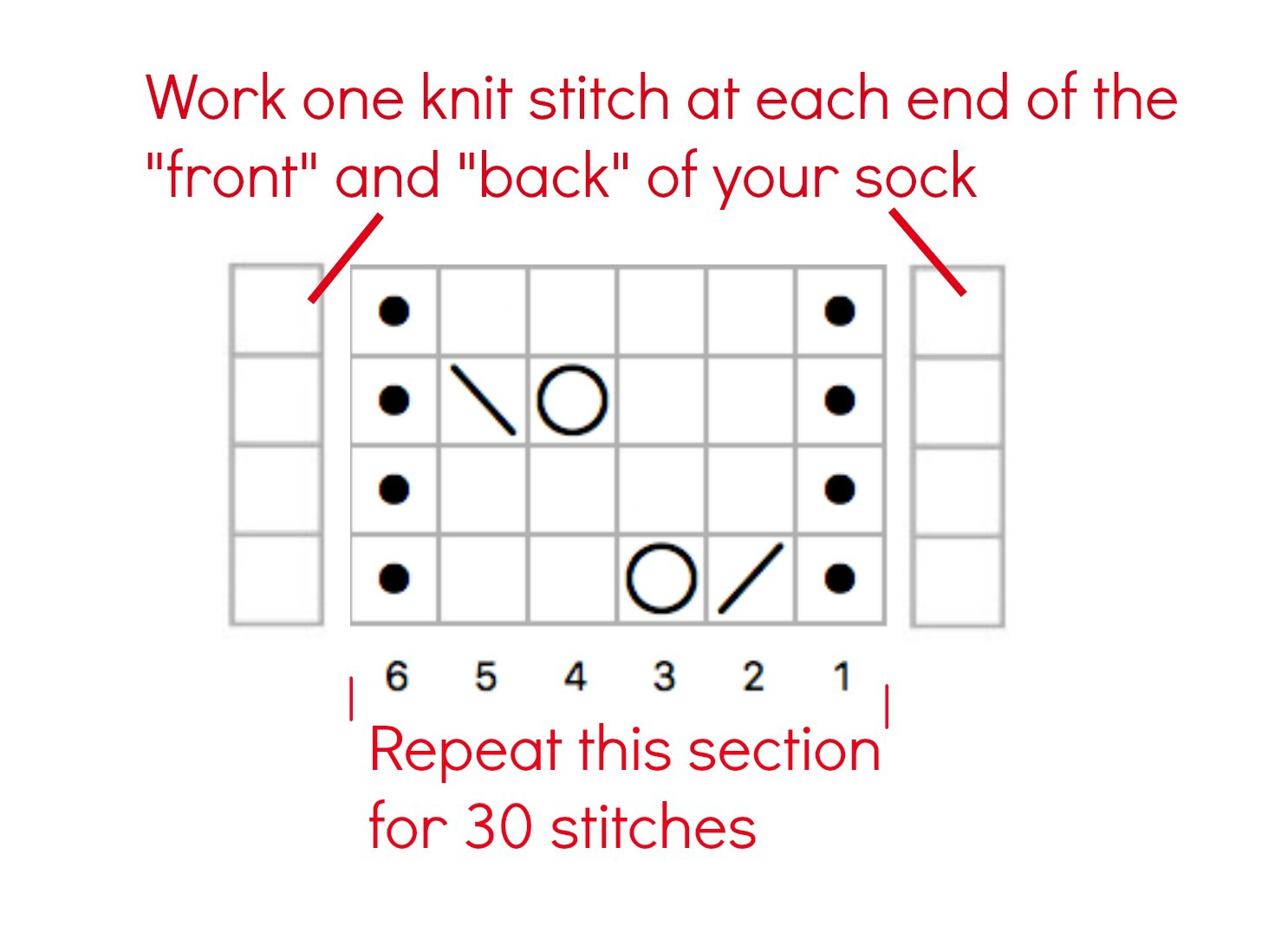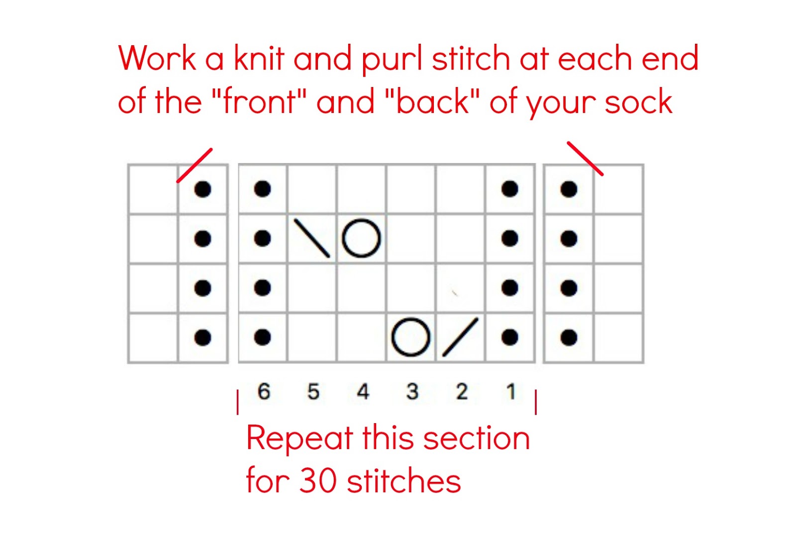 This pattern will be repeated right across each half of the sock (the front half and the back half, both of which are 30 stitches). If you cast on 64 stitches then you’ll have 32 stitches across the front and back of the sock so that will be one extra stitch on each side of the front and one extra stitch on each side of the back (a total of 4 extra stitches = 64). You need to do something with the extra stitch at each end but you can’t fit a whole pattern block in so you just need something that is in keeping with the rest of the pattern. In this case, I’ve suggested that you knit the stitch so that you don’t get a big block of purl stitches:
