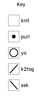 Every chart is created by showing a combination of symbols to represent each stitch. Once you can read a chart, you’ll see that it’s faster to do that than having to read written instructions all the time and just like using a road map when you’re out and about, you need a key to tell you what each of the symbols mean. There are some differences between symbols on patterns but for the most part they are a universal system and the pattern should always tell you what the symbols on the chart that is being used represent. Here’s the key for the Easy Lace Socks: