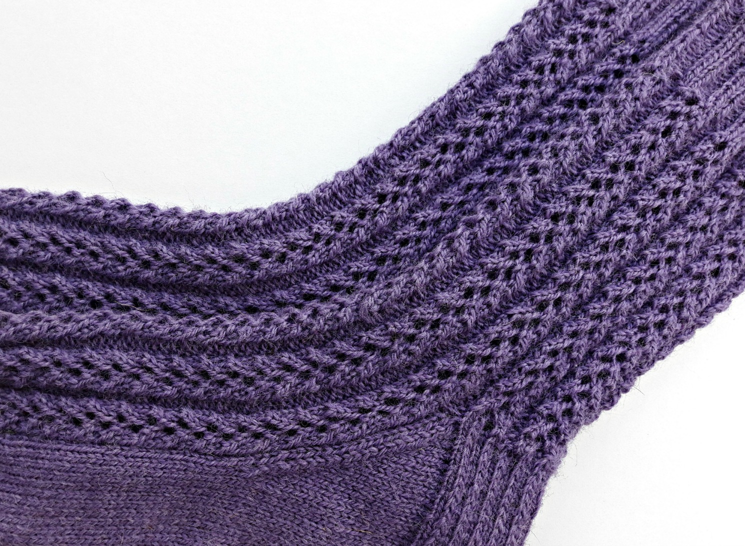These lace socks are constructed as top down socks with a heel flap and gusset heel. The heel is knitted in heel stitch, which creates a durable, cushioned heel. This pattern will create a medium-sized sock.