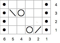 I know it looks like some kind of Battleships game but it’s really not that complicated when you understand how it works. Firstly, you can see that there are four rows (the numbers going up the right hand side) and six stitches (the numbers going along the bottom). The numbers go outwards from the first square on the bottom right hand side which is always the first stitch and that’s where you’ll start from, but we’ll talk about that in a minute.