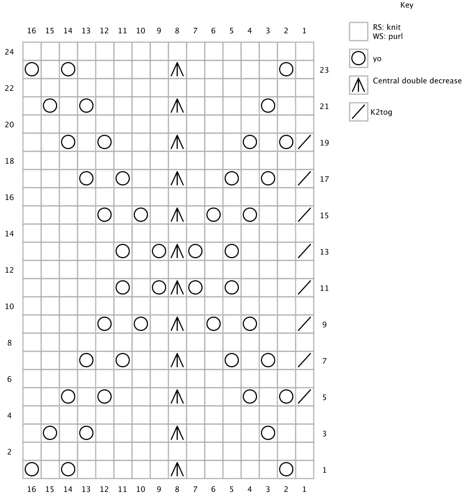 Row 7: Cdd, K3, yo, K1, yo, K2, cdd, K2, yo, K1, yo, K3.