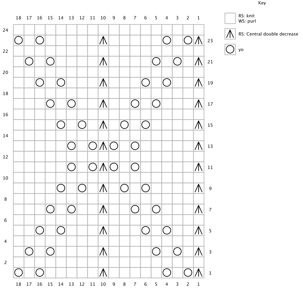 Row 1: (RS) Cdd, yo, K1, yo, K5, cdd, K5, yo, K1, yo. (18 sts)