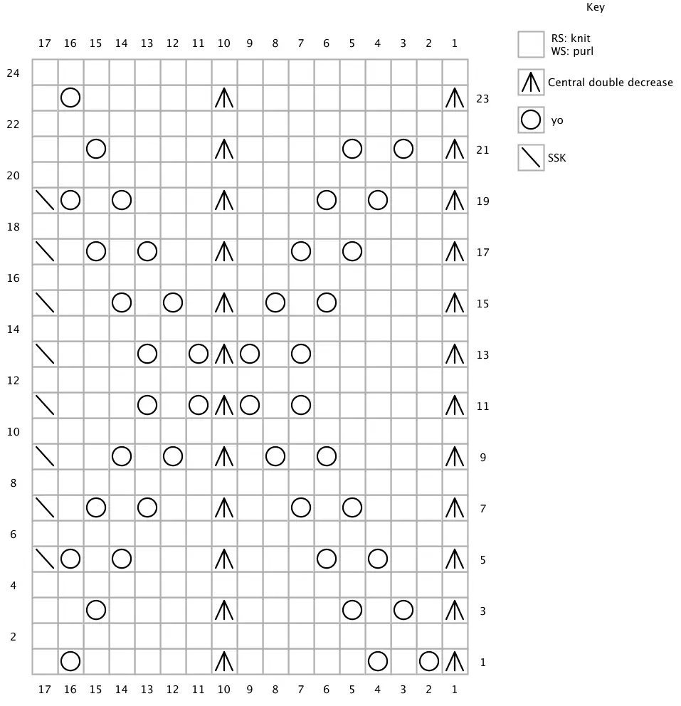 Row 1: (RS) Cdd, yo, K1, yo, K5, cdd, K5, yo, K1. (17 sts)