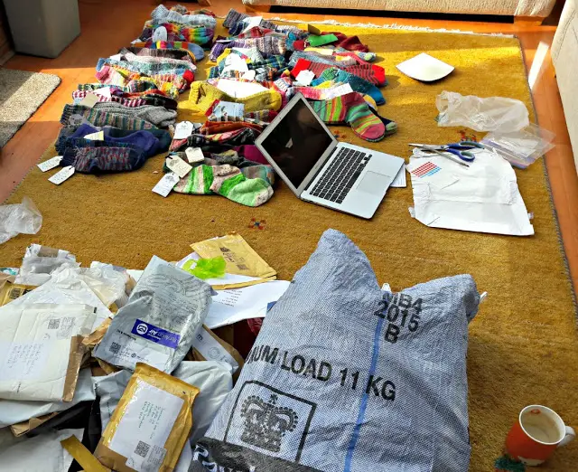 Here’s a photo one of my minions helping me to unpack the first of the socks. Small daughter had a surprisingly long attention span for this and we rattled through the packets, logging and photographing each pair of socks, in good time.