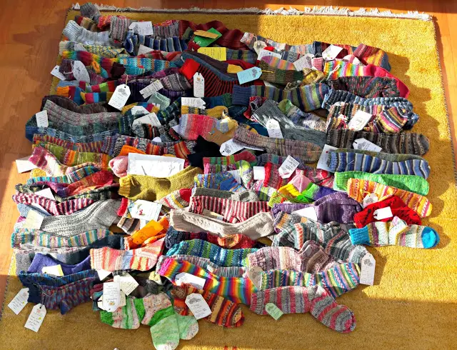 I like to make sure that I have a note of every pair of socks: where they come from, the colour, the size and who made them as it helps me to identify the socks and where they are going to go after Yarndale. I think that last piece of information about who made the socks is especially important as I like to be able to tell you where the socks have gone later. It completes the circle nicely, I think. Every single one of these pairs of socks have been knitted with love for someone that the knitter will never know. I do go on about this a bit but I think it’s important to keep saying it, because in our world where the media likes to focus on what’s going wrong, we need to remember that some things are going right. I like to think that when I tell you that the pair of socks that you knitted has gone to, say, a homeless hostel or a children’s hospice, you will smile, your heart will smile and that moment of connection will send love and positivity out into a world that needs all the love it can get.