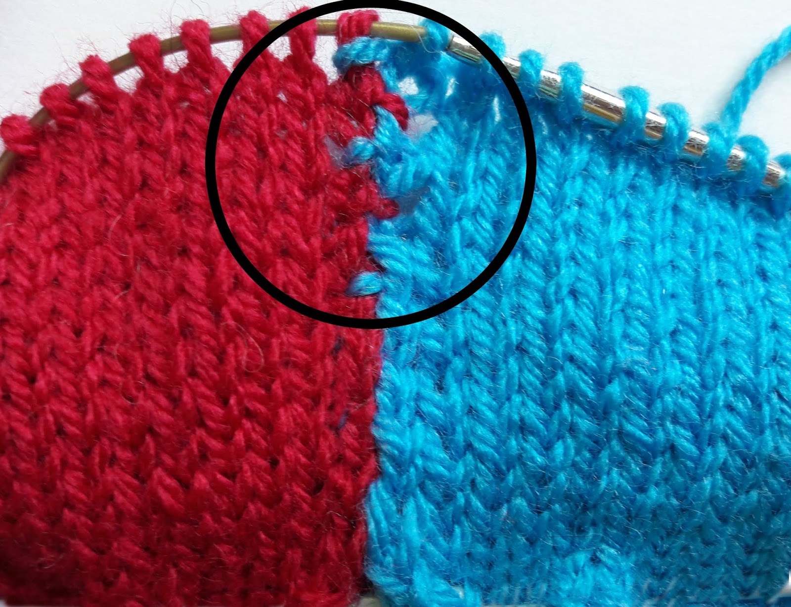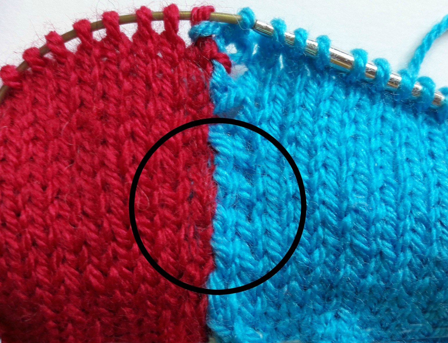 and then twisting it around the previous yarn so that you don’t get a hole, knit across the first couple of stitches …