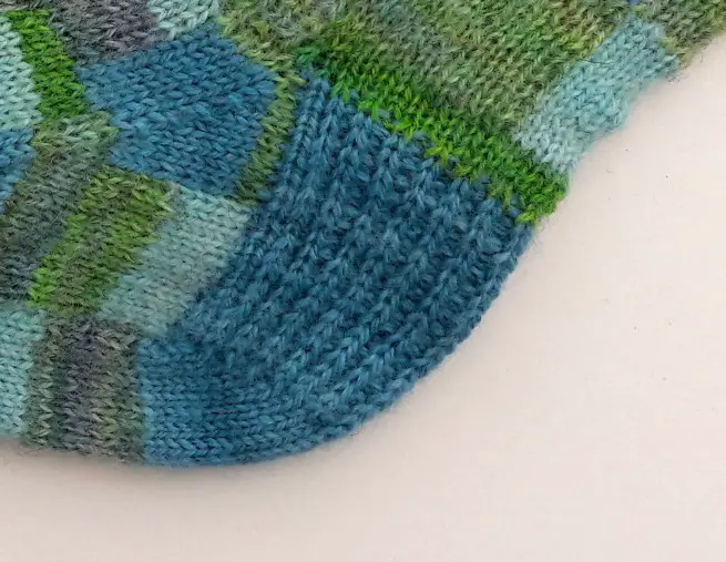 I’ve chosen to knit the toes in one colour but you can continue the patchwork pattern if you want to – just be aware that the joins between the colours might become a weak spot for pokey toes!