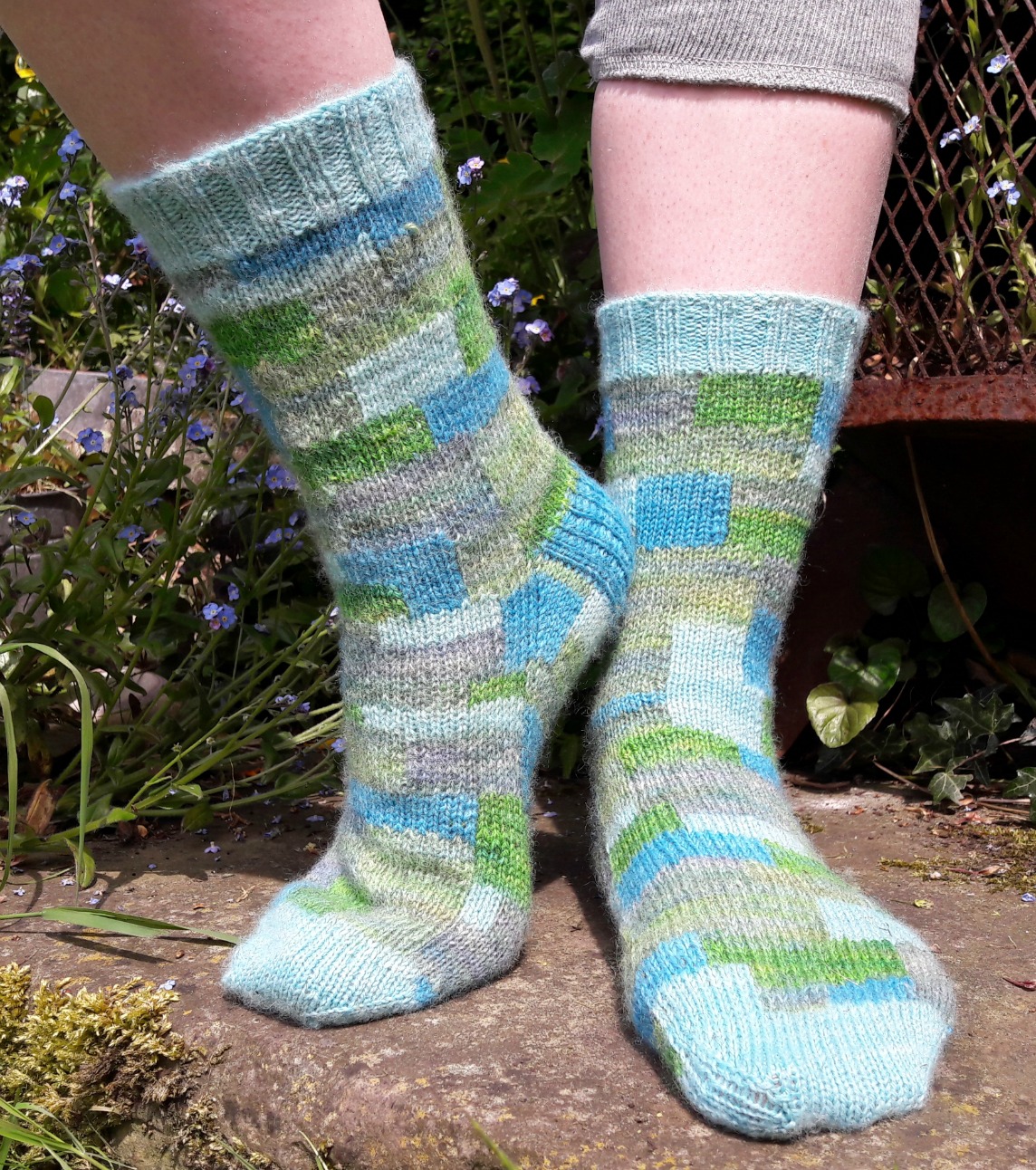 I created this pattern to show off mini-skeins of yarn, although you could just as easily use leftovers. I like the idea that multi-coloured socks don’t have to be striped or variegated and that we can create the blocks of colour for ourselves which works perfectly with the intarsia method of knitting.