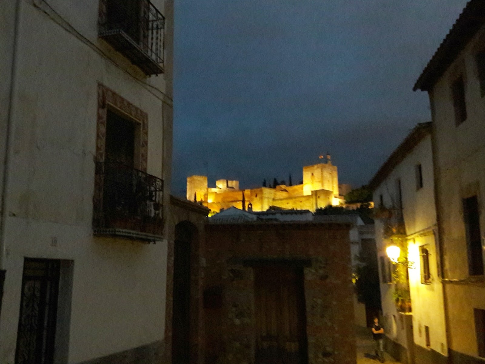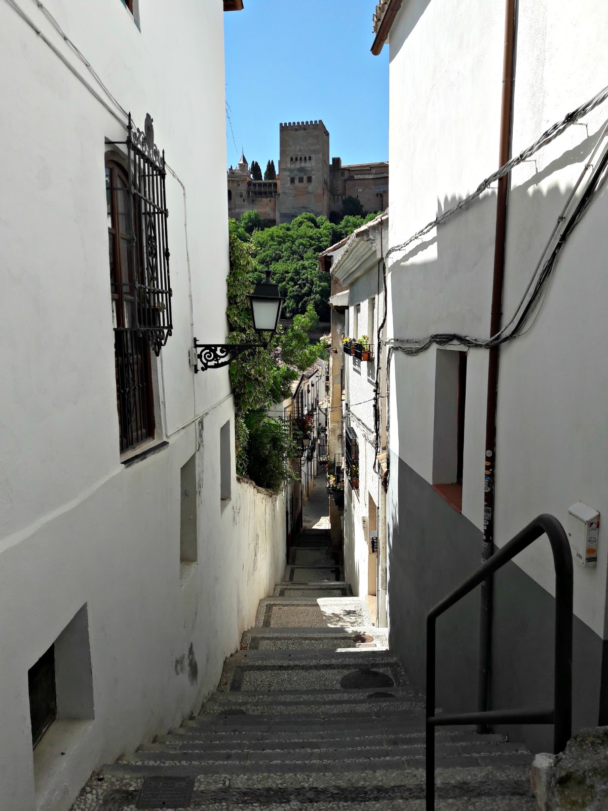It’s a very pretty street overlooking the Darro river and overlooked itself by the Alhambra which is actually a walled city containing royal apartments, gardens, fortifications and barracks. The name is given to the red stone that was used for the walls and the Alcazaba fortress.
