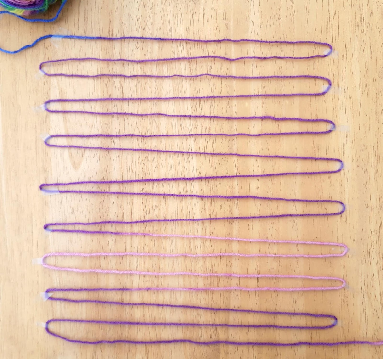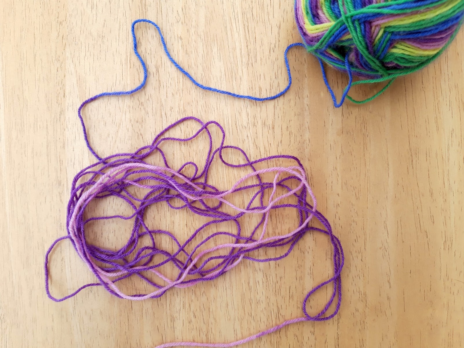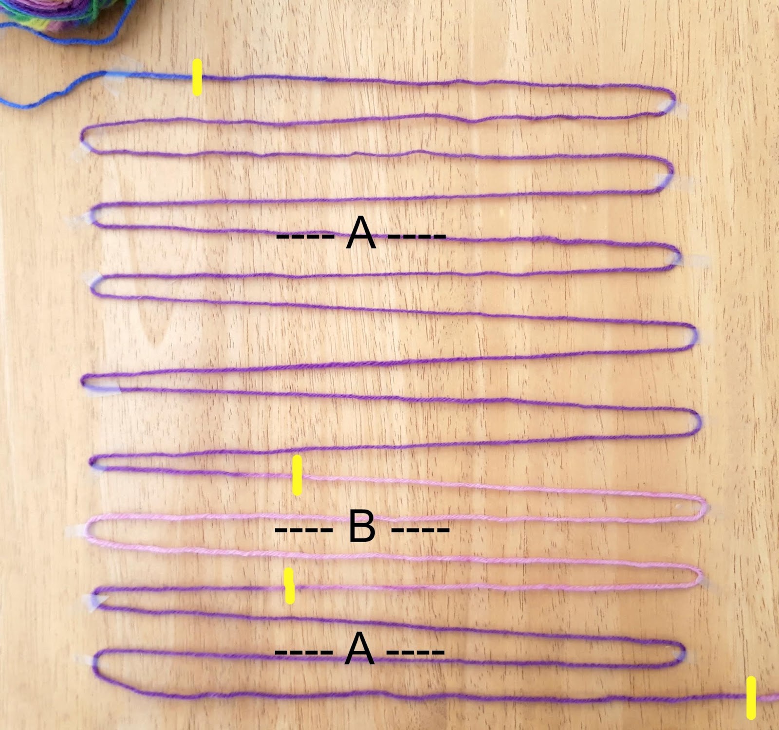 2 Look at the colours in the yarn that you’ve pulled out. I’m using Wildflower here and I’m working upwards from the bottom of the photo. You can see that the first colour out of my ball is purple (A) followed by pink (B), followed by purple (A). The sequence is always a short block of A followed by a short block of B followed by a long block of A and it works that way whether you pull from the outside or the inside. All of the colours in each of the yarns work in exactly the same way.