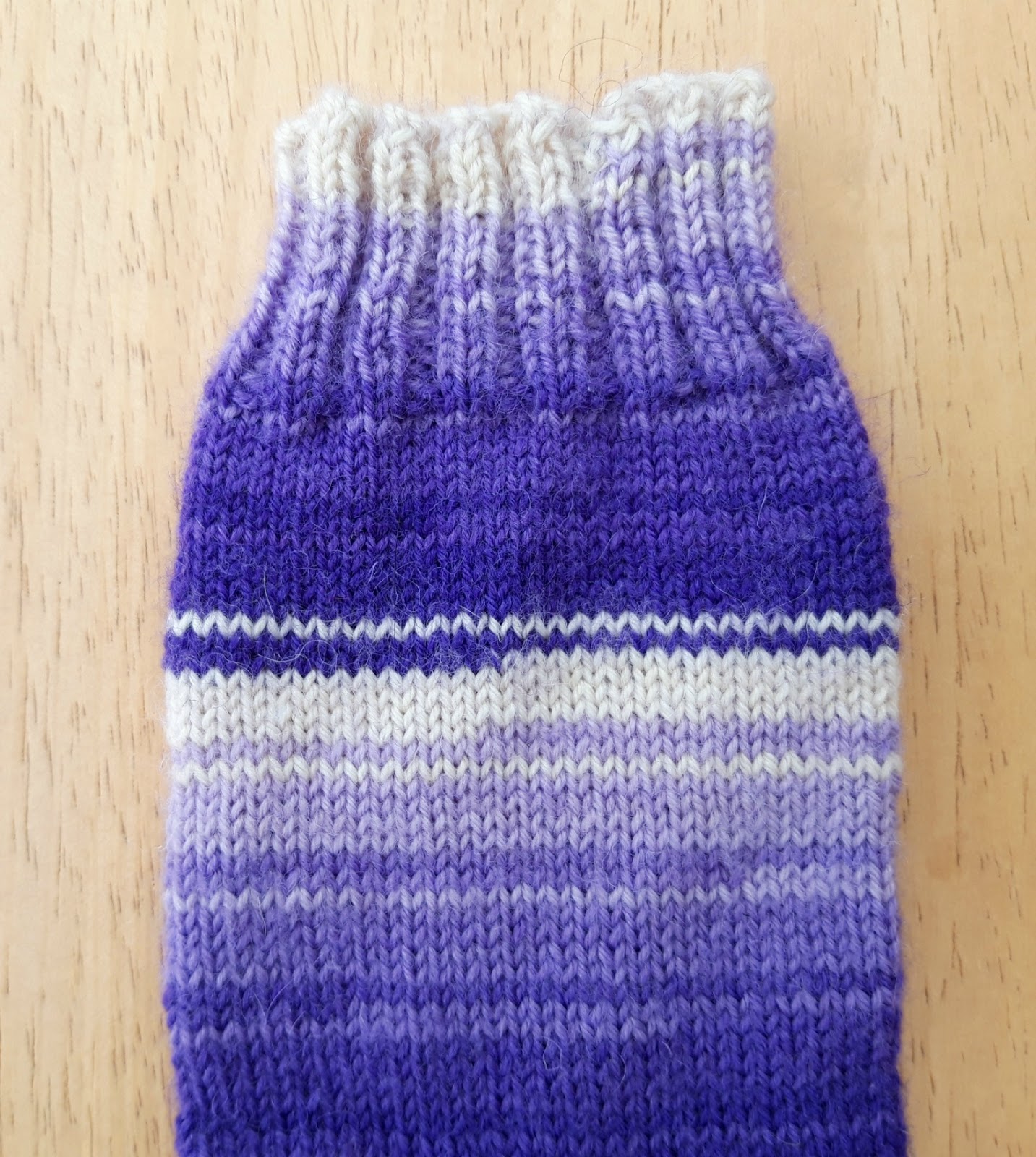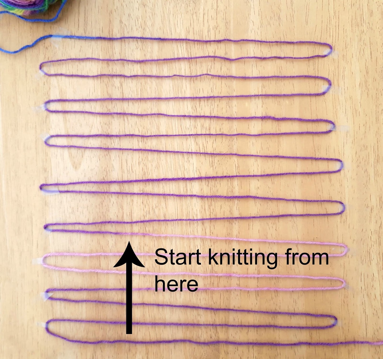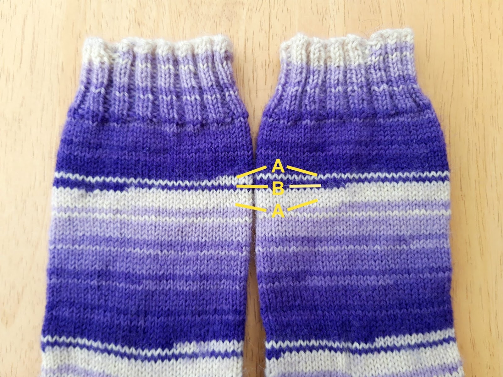 3 Start knitting from the long block of colour A so that you get a big section of colour at the start of your sock, and that way it’s always easy for you to match the second sock. It doesn’t matter if you choose to start at the shorter colour A block, but if you knit your socks by casting on the cuff and working 2 rows before joining into the round as I do, then you’ll find that your sock looks better starting with the larger colour A block. It’s your sock, though! 🙂