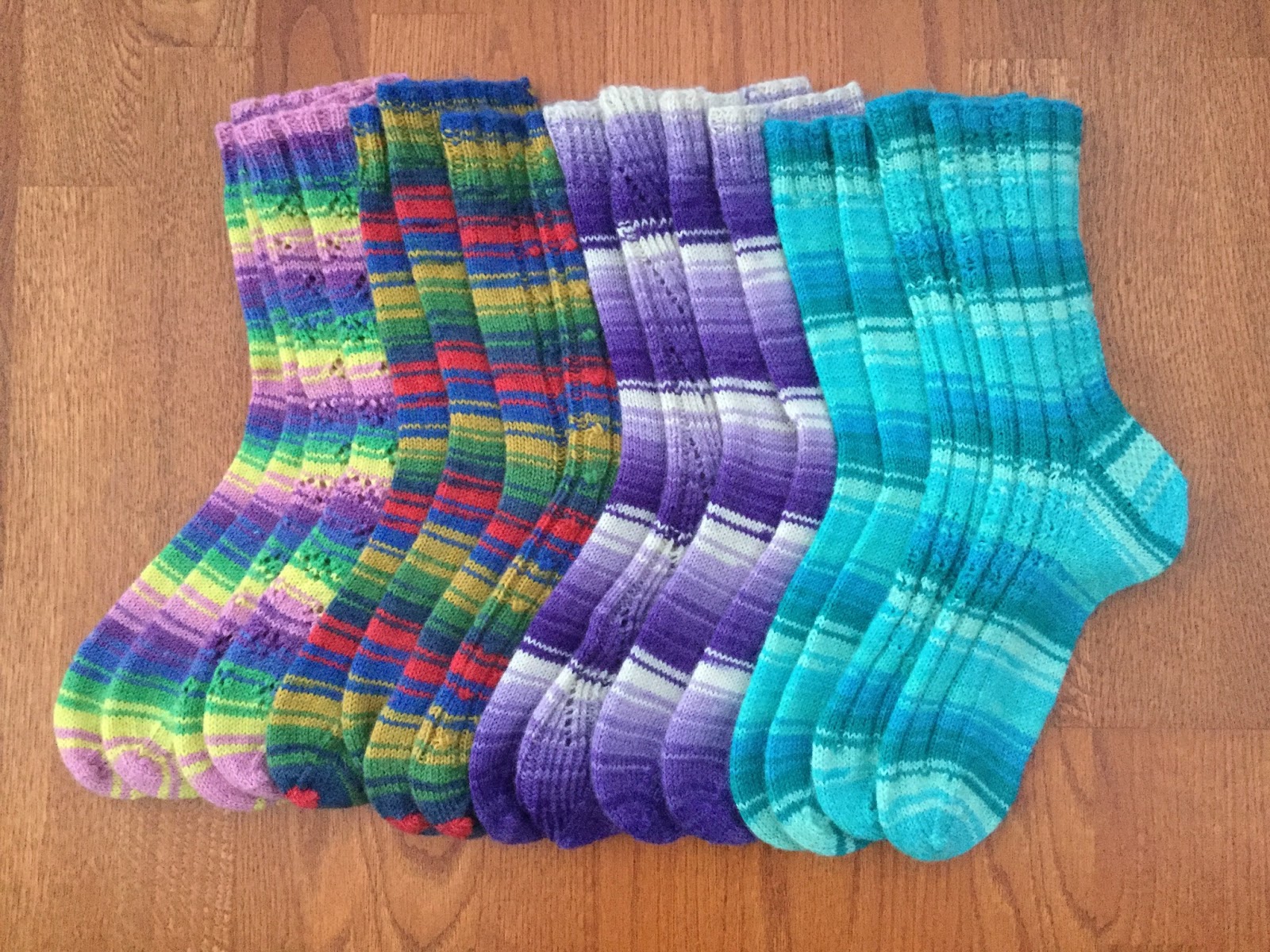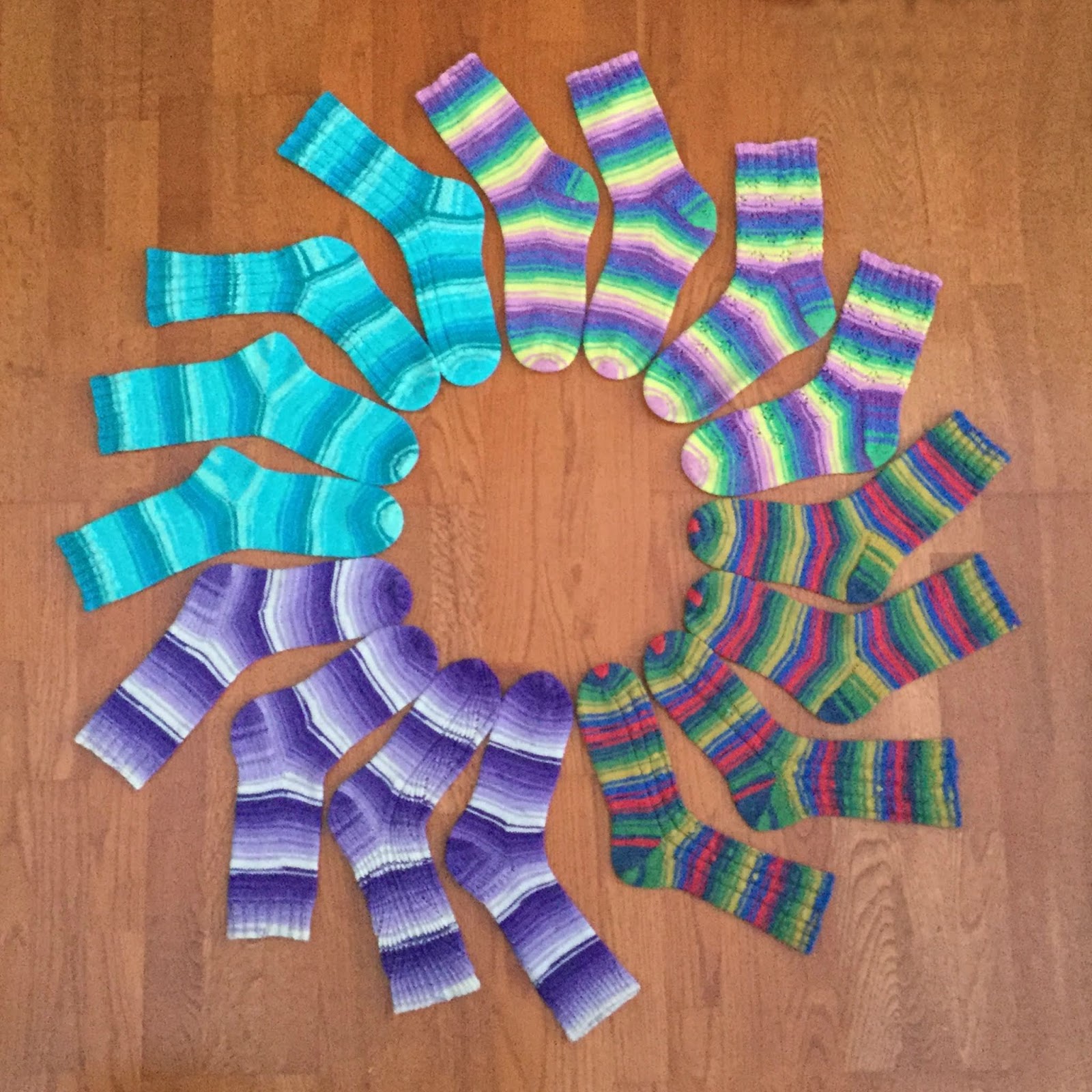 The coloured bands all follow the same sequence which links them to the colour before and all you have to do to get your socks to match is follow the steps below. It doesn’t matter whether you choose to pull from the centre or from the outside of the ball as the yarn will still match in both directions. My socks are all knitted top down but even if you knit toe up the sequence will still work in the same way.