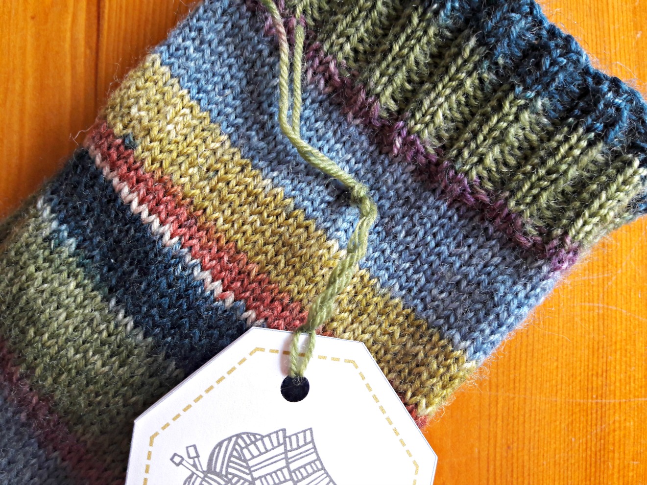 The label needs to be securely attached to your pair of socks and have your name (your first name is fine), the place you live, the size of the socks (in UK size, please) and what the yarn content is in case anyone has issues with wool. If there are any particular washing instructions you may want to squeeze those on too.