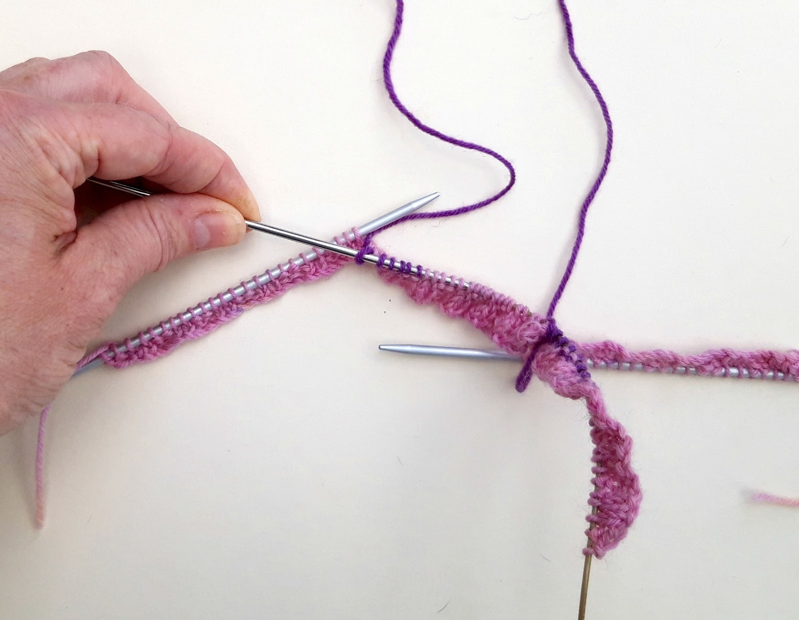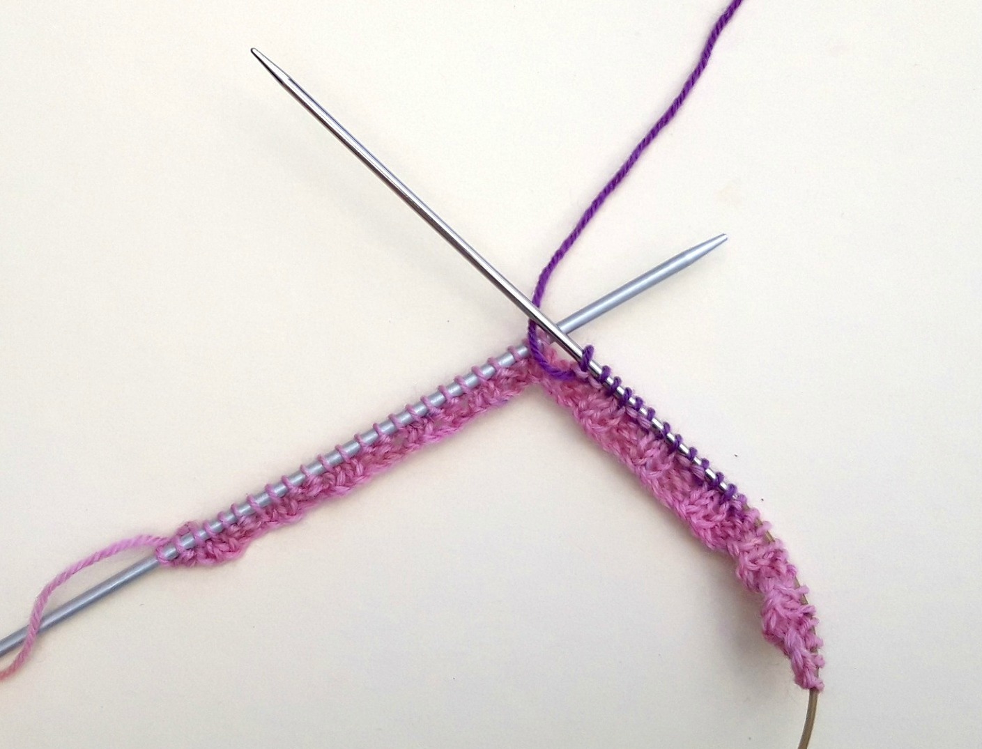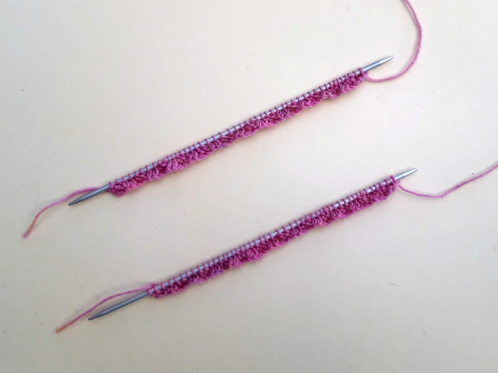This is what your knitting will look like once you’ve knitted half the stitches off both of the DPNs.