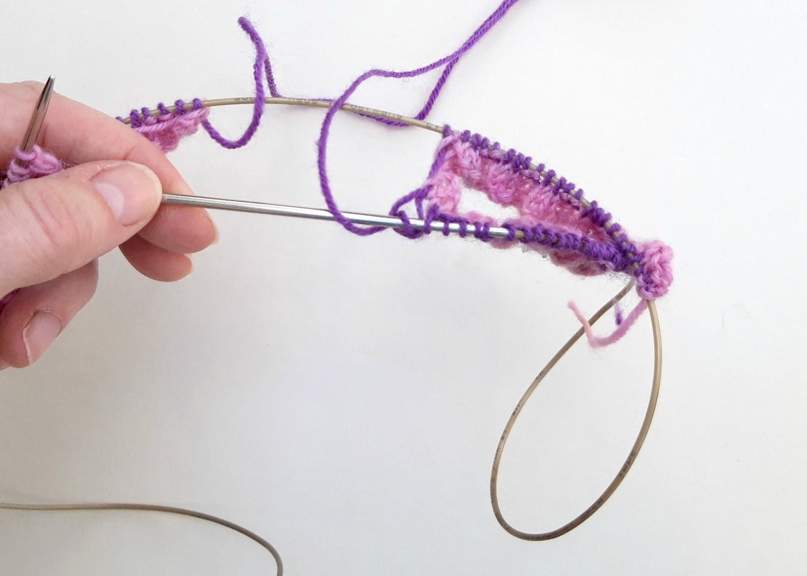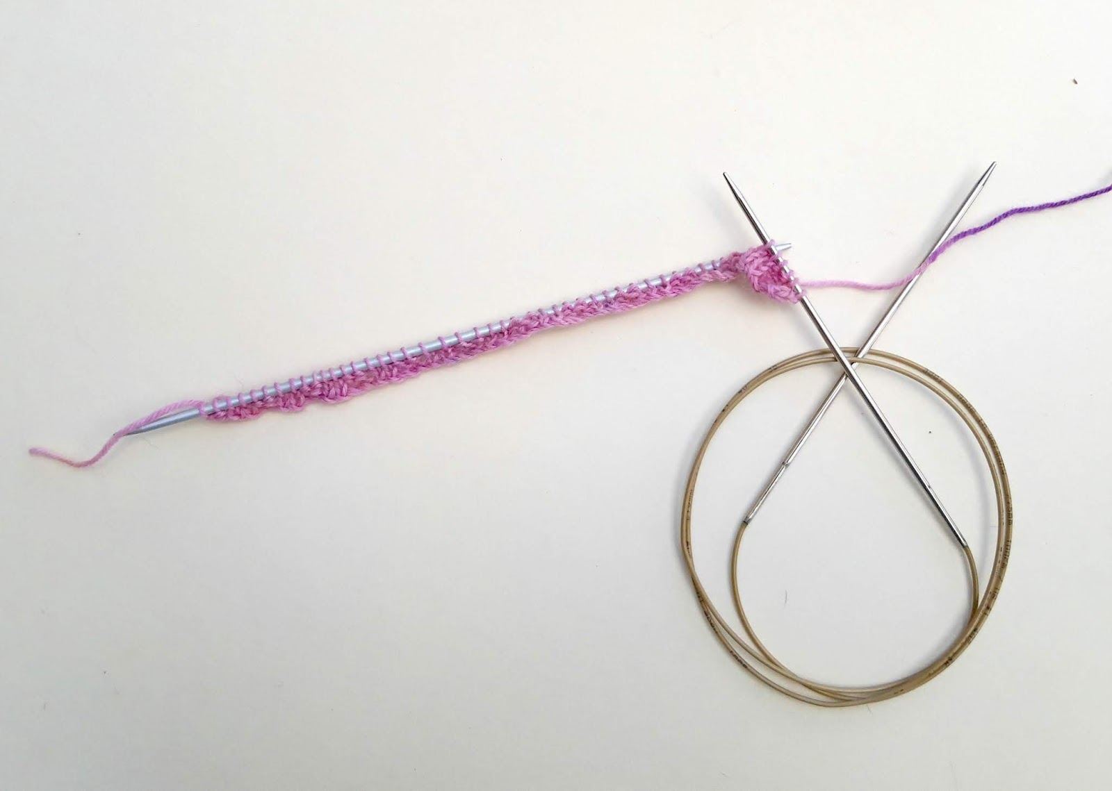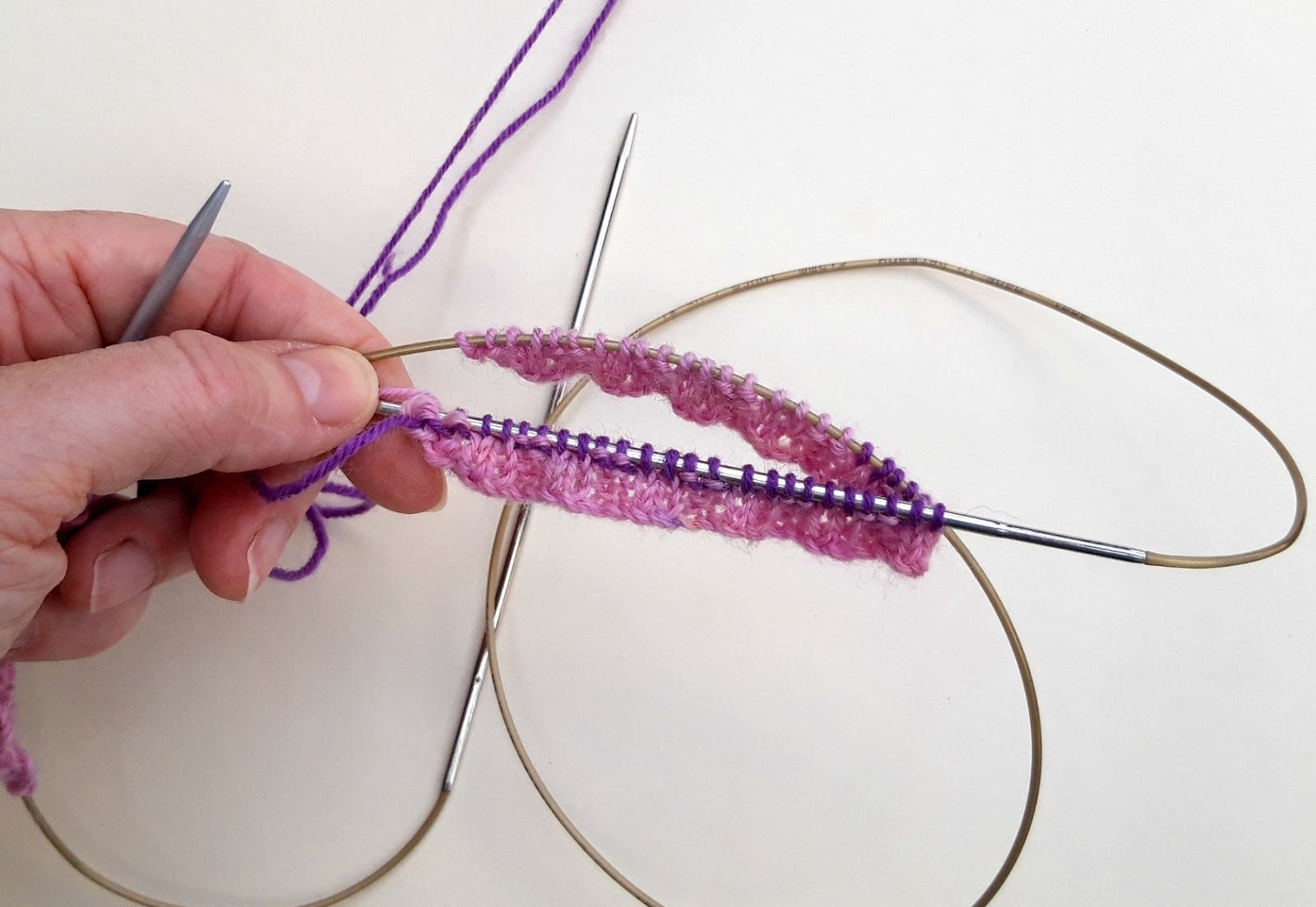 Here’s where we’re going to join into the round. I find it easiest to think of magic loop socks having a “front” and a “back” so I’ll refer to front and back stitches as we go along. We’re going to start with the front of your sock.