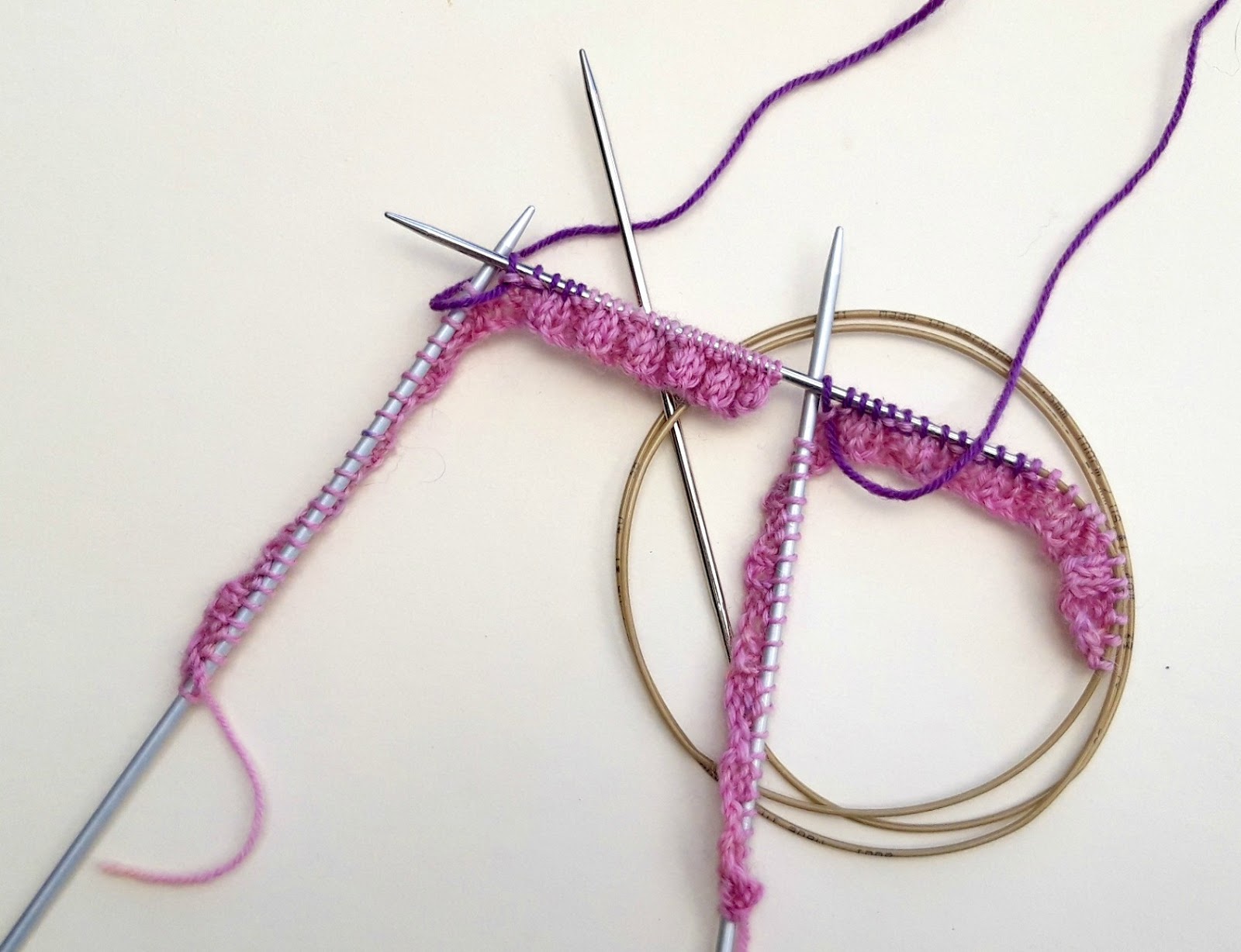 Start by working half of the stitches off the first needle onto your long circular needle, continuing in the K2 P2 rib that you worked on the DPNs.