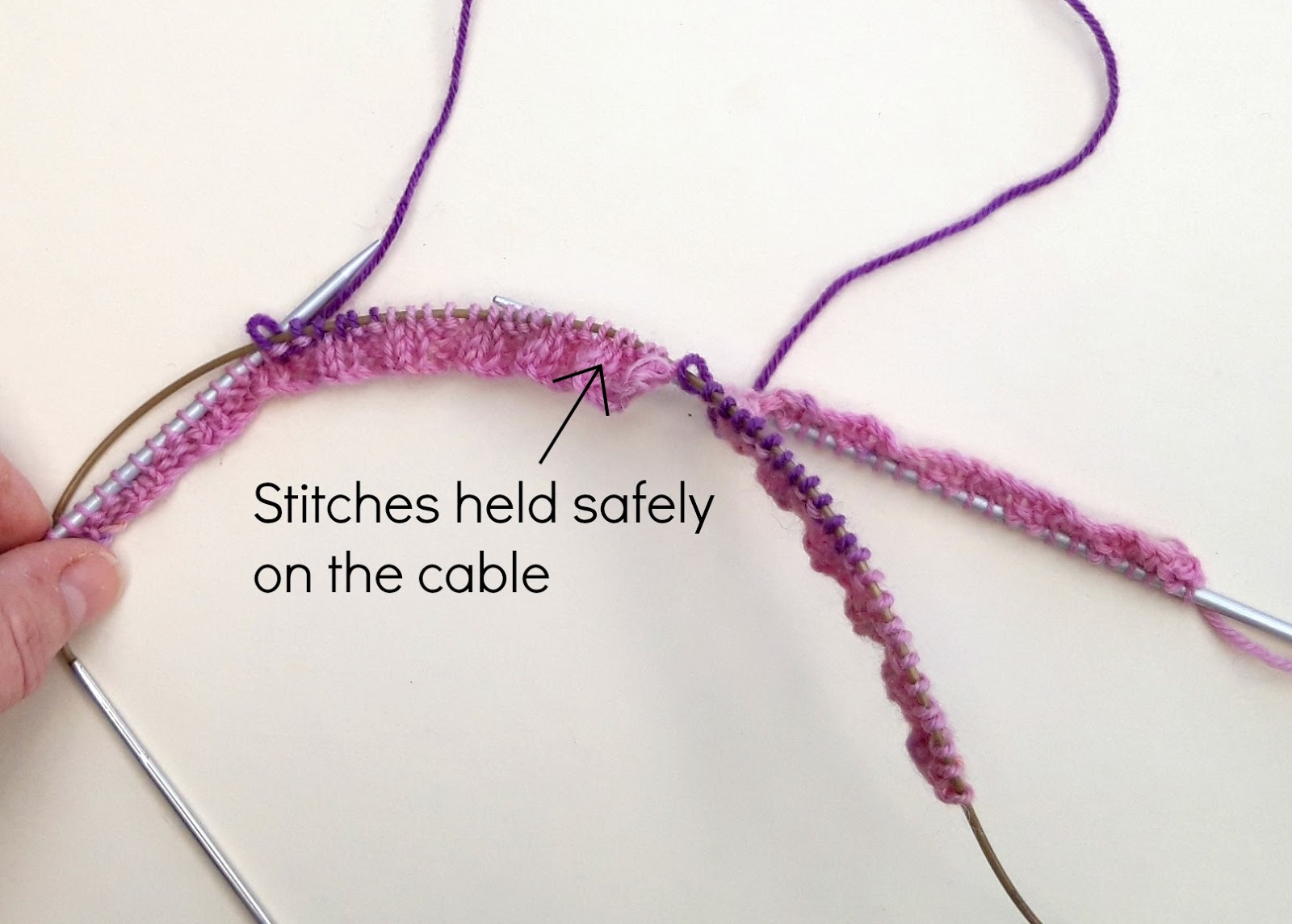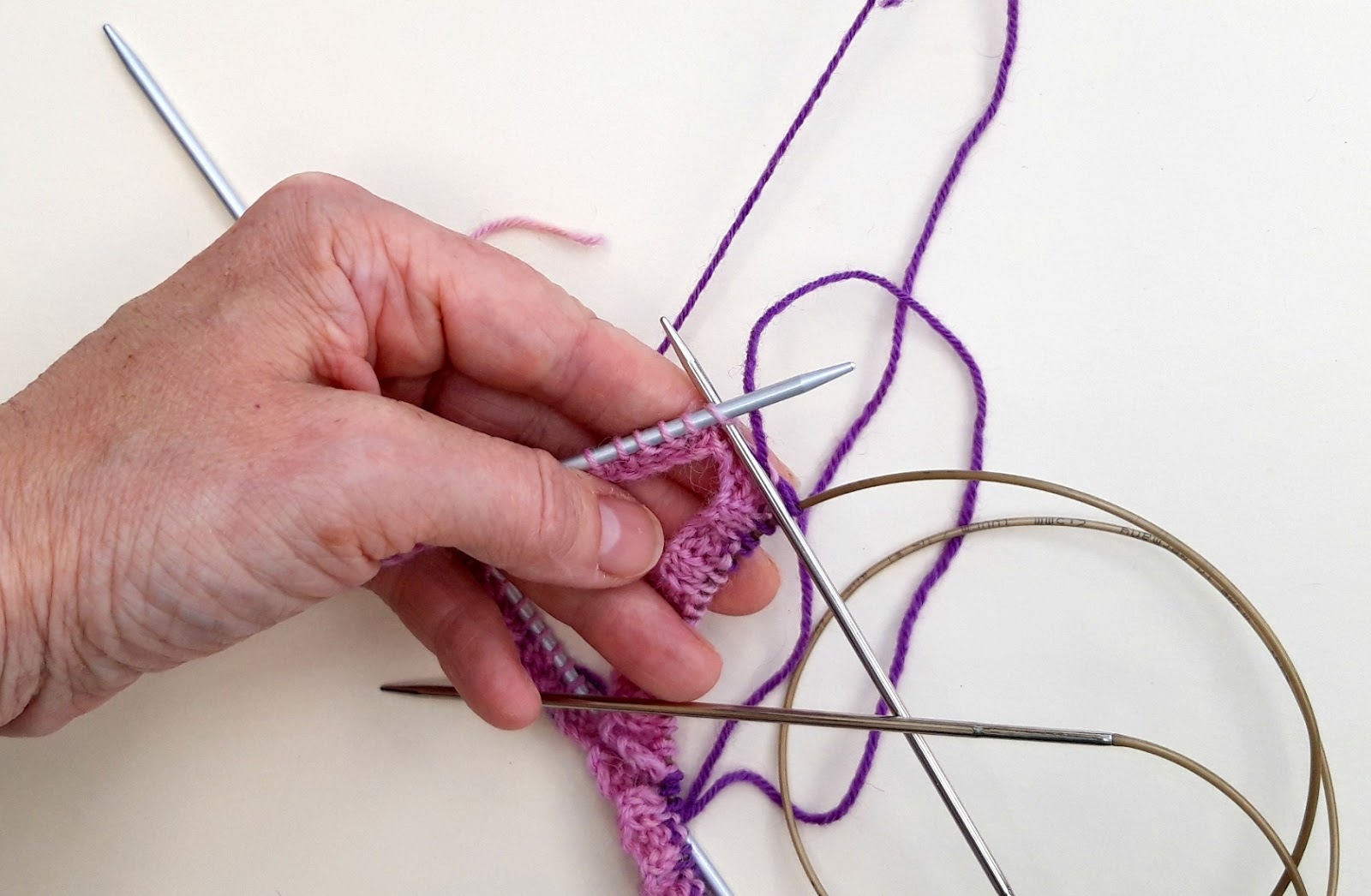 Here comes another fiddly bit so read this through first! You’re going to get hold of the tip of your long circular needle (make absolutely sure you’ve got that and not a DPN!) with your left hand and you’re going to slide all the stitches you’ve knitted onto the cable with your right hand, leaving you with a length of needle tip and cable in your left hand and the stitches sitting safely on the cable to the right.