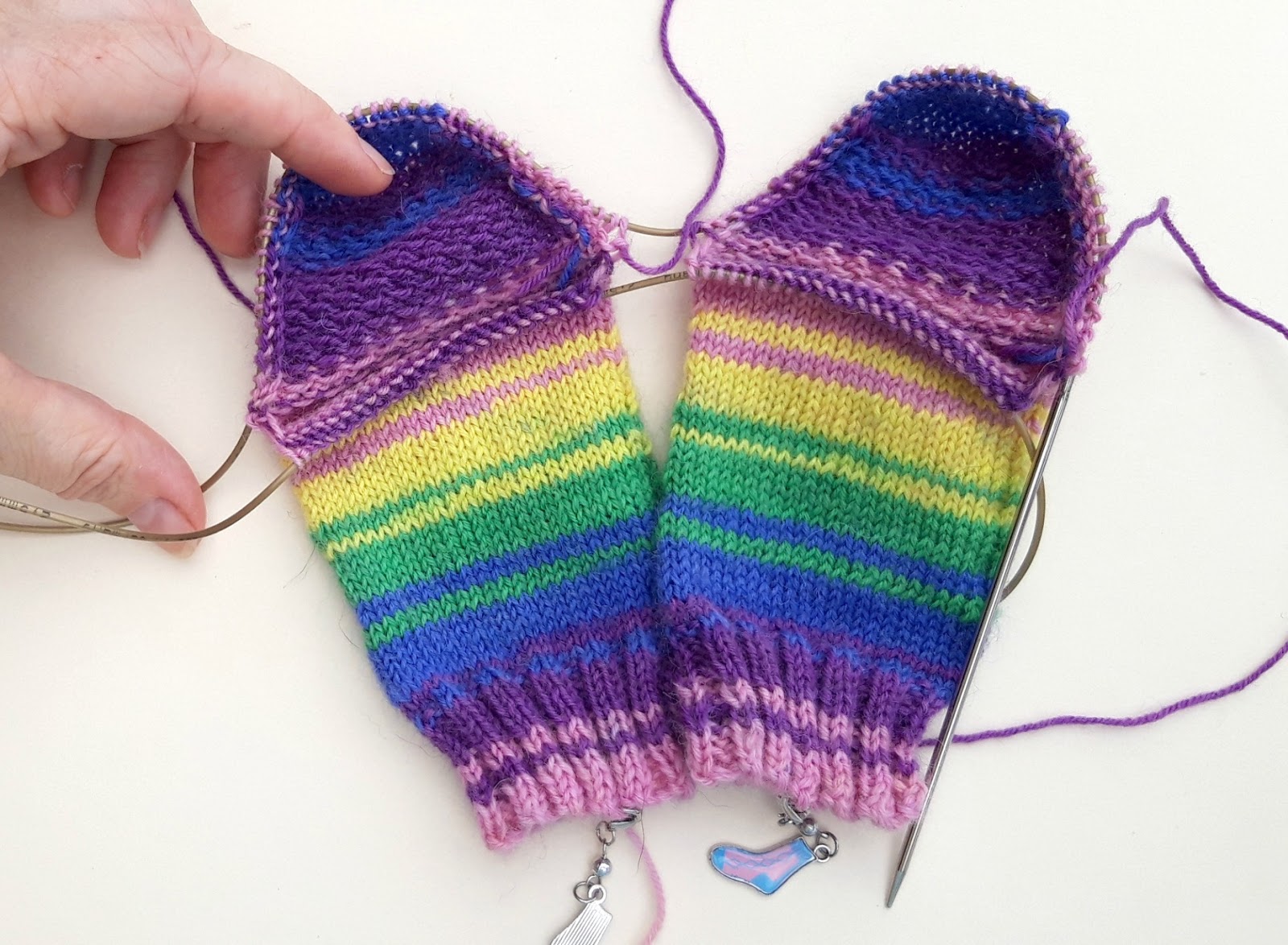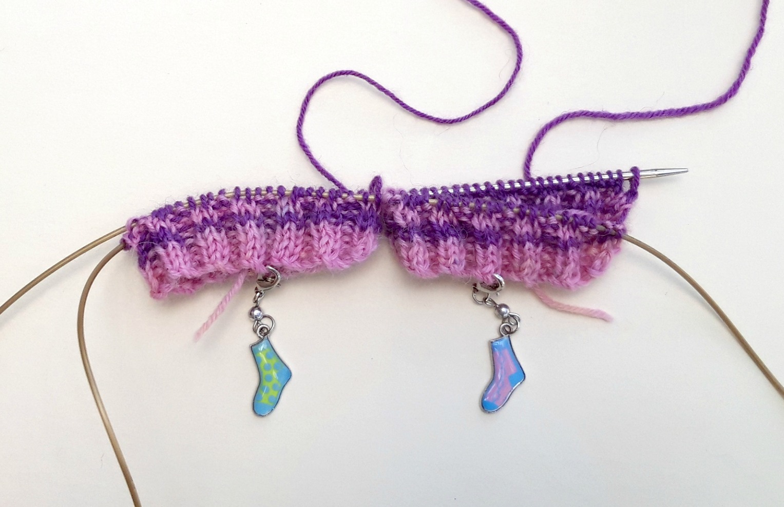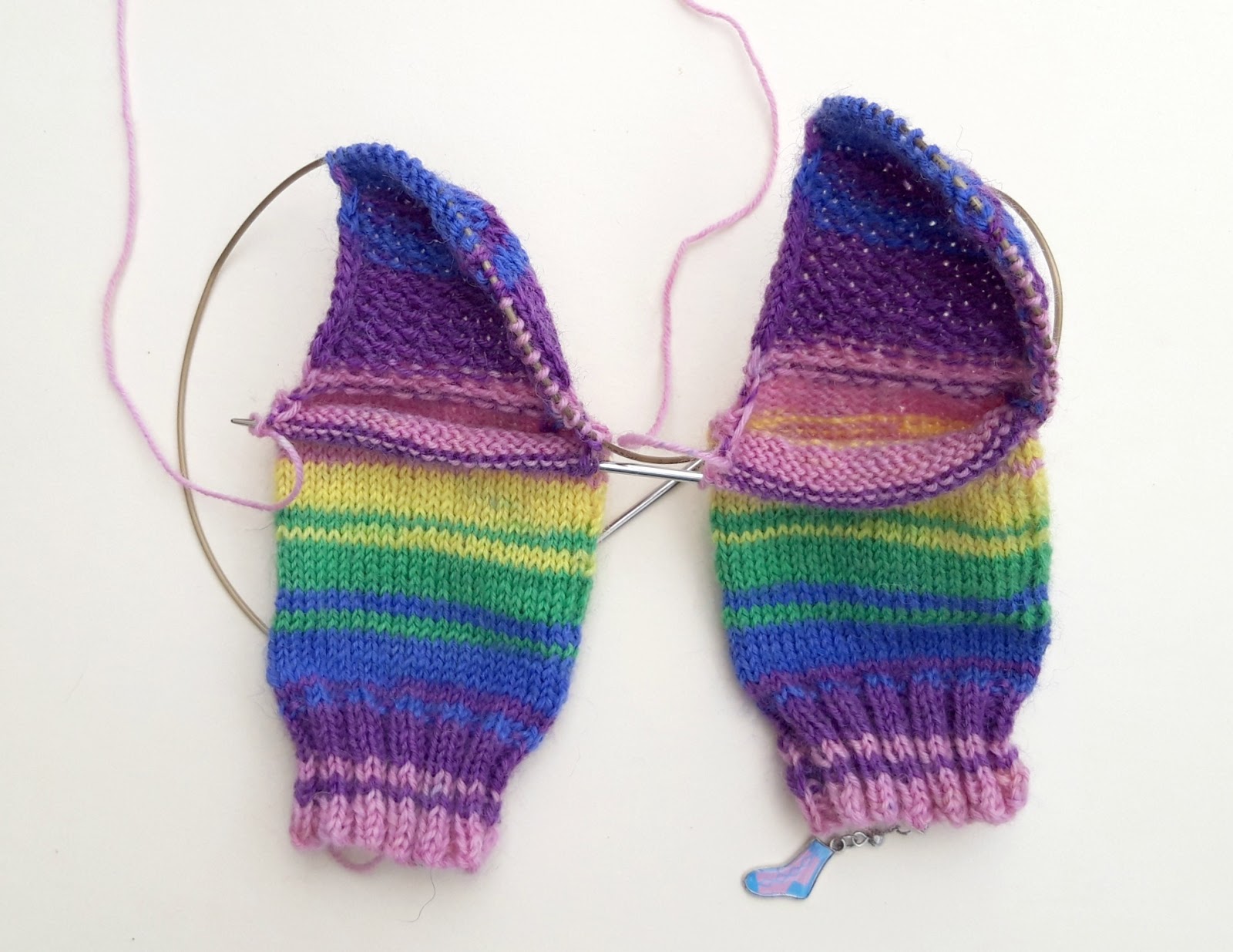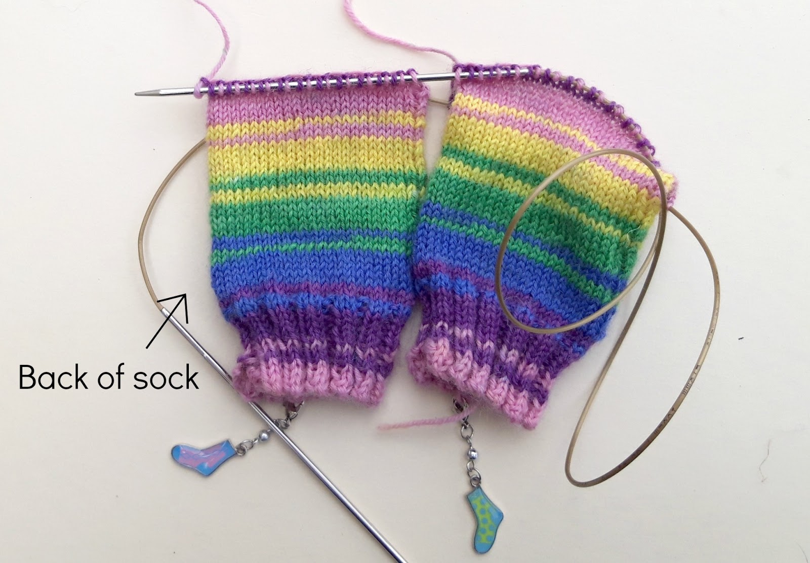 What I like to do now is to add a marker so that I know which is the front and back of my sock. You can tell by the tail end, but it’s easier to have a more obvious visual marker then there’s no risk of getting mixed up if you get distracted mid-row. I’m using these progress keepers that came from a knitting magazine (I couldn’t resist those tiny socks!) but anything will do – safety pins, badges, even paper clips as long as you can see which side of your sock is which.