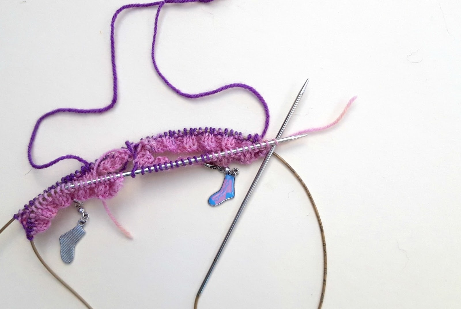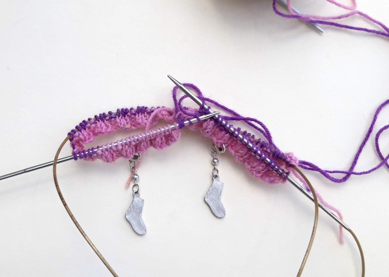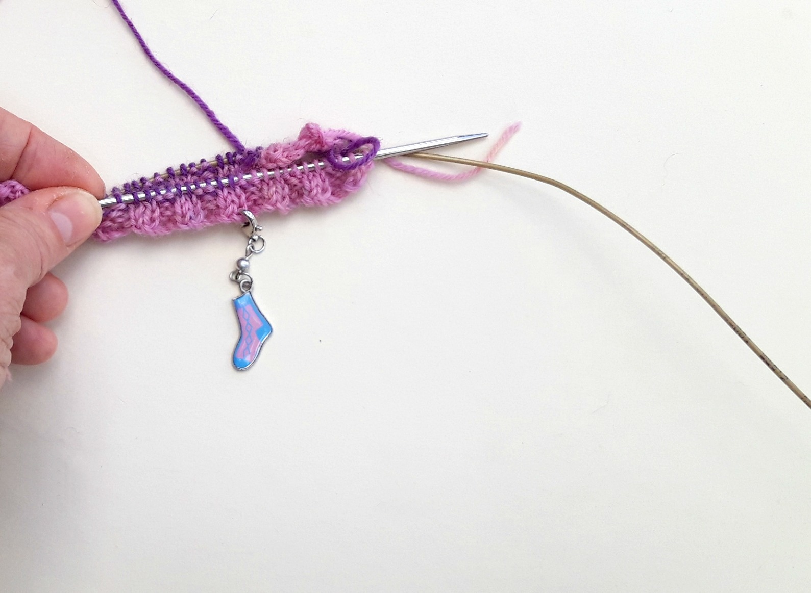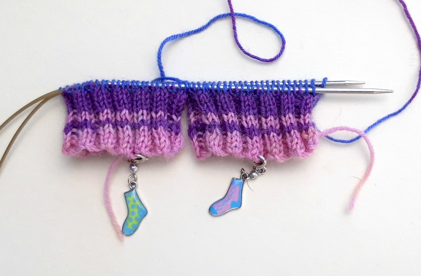 What I like to do now is to add a marker so that I know which is the front and back of my sock. You can tell by the tail end, but it’s easier to have a more obvious visual marker then there’s no risk of getting mixed up if you get distracted mid-row. I’m using these progress keepers that came from a knitting magazine (I couldn’t resist those tiny socks!) but anything will do – safety pins, badges, even paper clips as long as you can see which side of your sock is which.