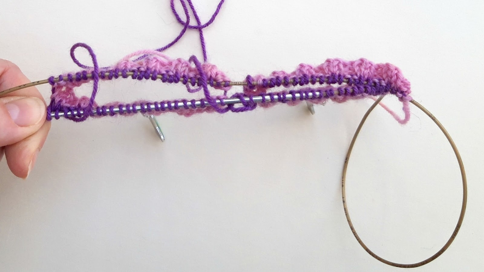 This is what you should have now. The stitches of one sock will be completely contained by the needle, and the other end will look like this, and this is where you’re going to make your first join.